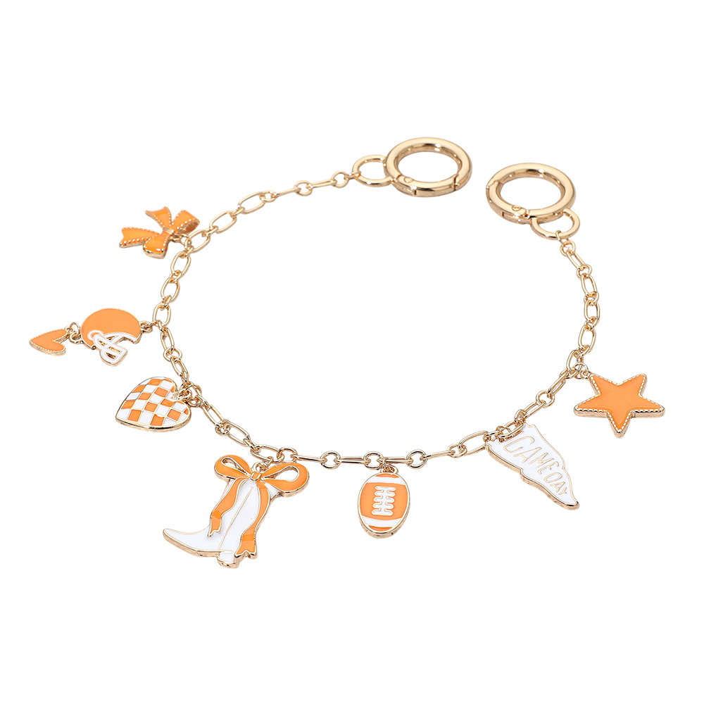 • Bag charm featuring playful gameday accents including football, helmet, boots, stars, hearts, and cheer icons. A fun accessory to show team spirit, personalize bags, and add a sporty touch to gameday outfits.