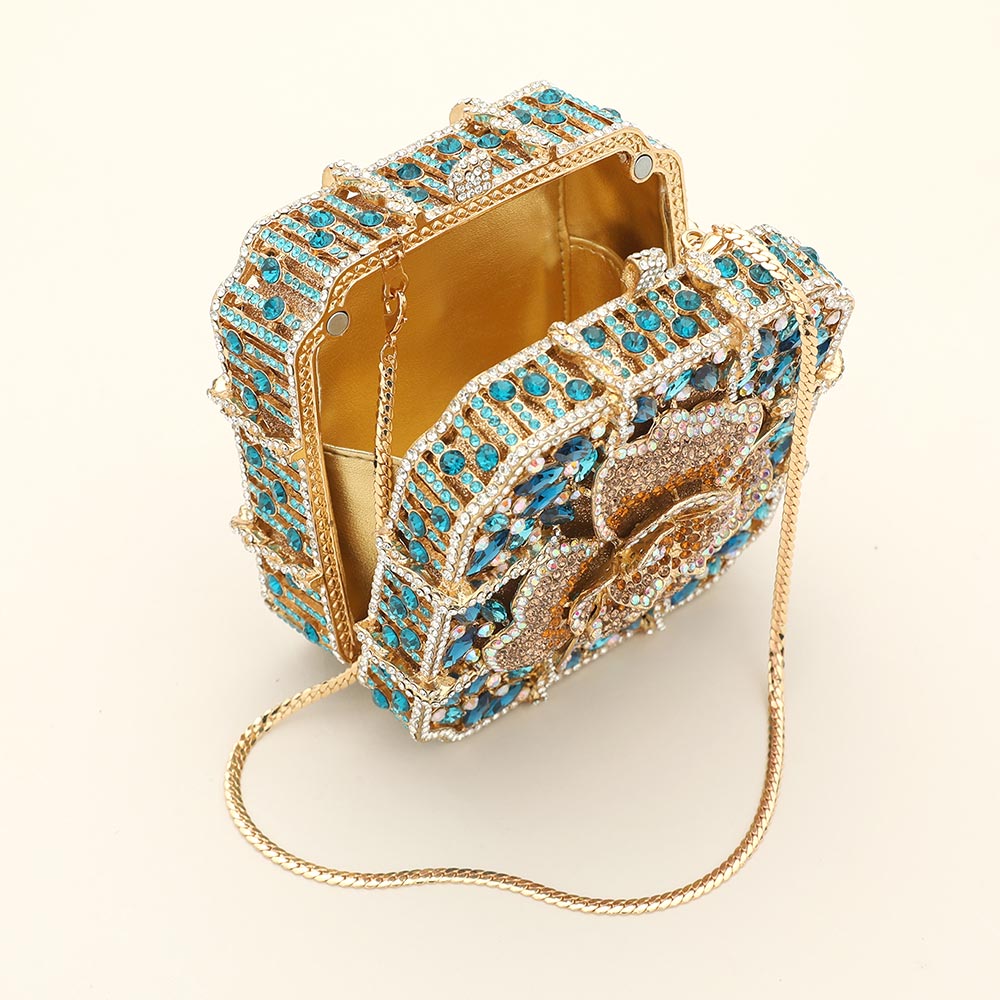 • Make a dramatic entrance with this floral crystal box evening clutch featuring a bold sculpted flower motif, faceted embellishments, and a structured silhouette. Ideal for weddings, galas, and formal events, it holds essentials in standout style while adding glamorous impact to any outfit or gift occasion.