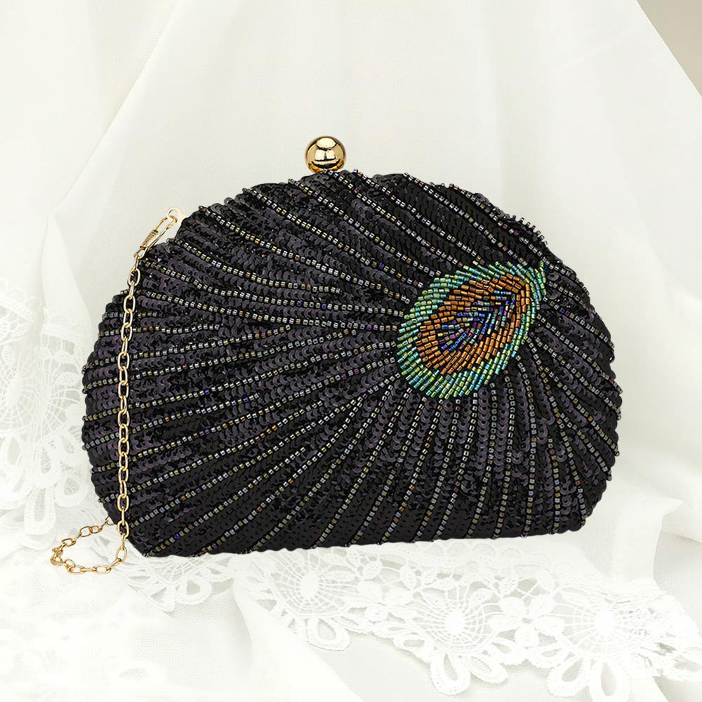 Details • Size : 8.25" X 6" X 1.75" • Strap Size : 46" L / Detachable • Clasp Closure • Elevate your style with this peacock inspired sequin clutch featuring radiant beadwork, shimmering sequins, and a detachable chain strap. Perfect for evening events, weddings, and parties, this elegant purse adds bold sophistication to any outfit.