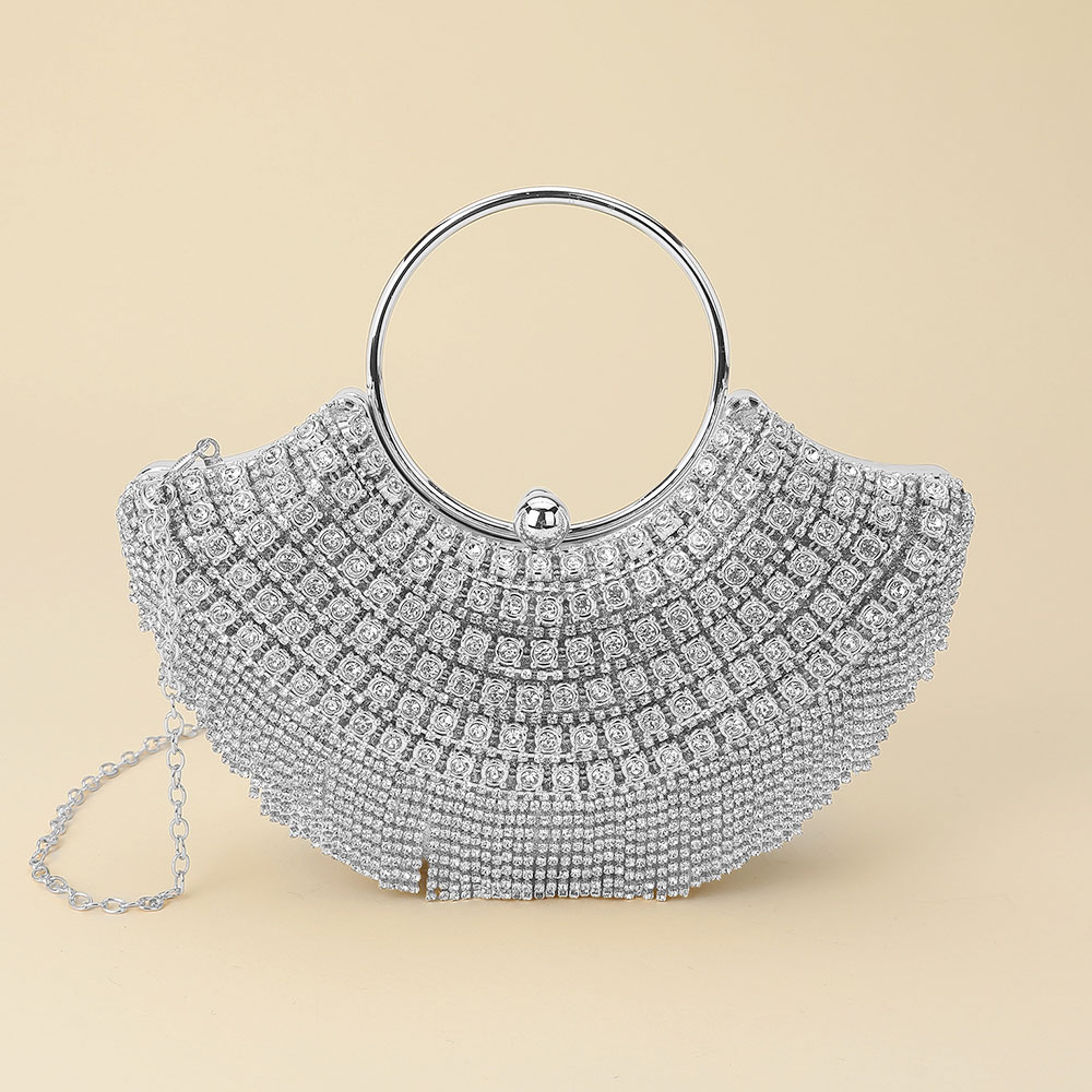 • This radiant crystal evening bag dazzles with intricate rhinestone embellishments, a sleek round handle, and cascading fringe accents. Perfect for glamorous events, weddings, or formal soirĂ©es, it adds a stunning sparkle and modern elegance to any special occasion ensemble.