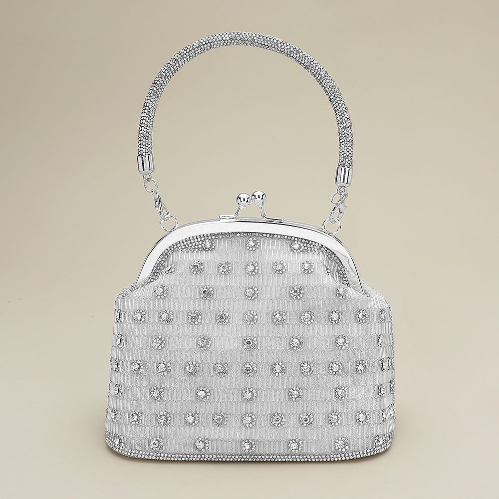 Details • Size : 7.5" X 6" X 4" • Strap Size : 46" L / Detachable • Clasp Closure • Discover a refined evening handbag featuring intricate embellishments, a structured frame, and a sparkling top handle designed for timeless sophistication. Its secure clasp and smooth interior offer both elegance and practicality for special occasions.