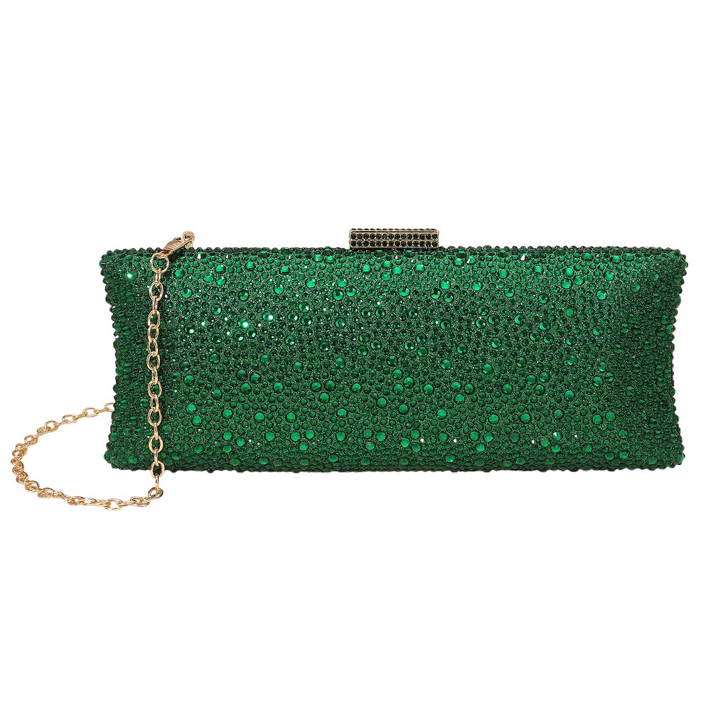 Details • Size : 9.5" X 4" X 2.25" • Strap Size : 46" L / Detachable • Clasp Closure • This dazzling rhinestone clutch adds instant glamour to any evening look. Featuring a sleek rectangular design and a detachable chain strap, it offers versatile carry options. Perfect for weddings, parties, or formal events, this clutch keeps essentials secure in chic style.