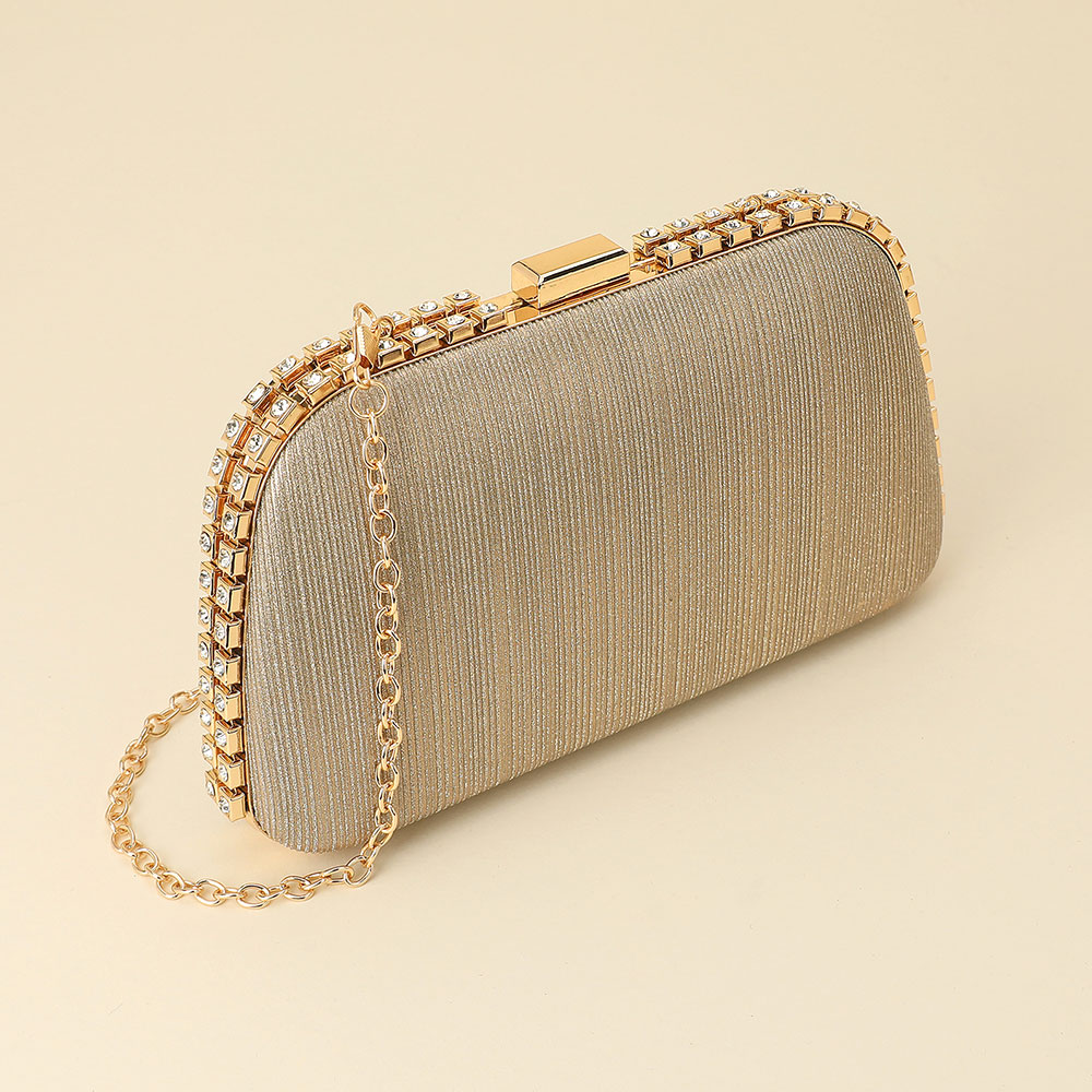 Details • Size : 8" X 4.25" X 1.5" • Strap Size : 46" L / Detachable • Clasp Closure • Chic evening clutch featuring a textured finish, shimmering rhinestone trim, and a detachable chain strap. Designed with a sleek clasp closure and gold-tone accents, this sophisticated handbag is perfect for weddings, parties, and formal events, adding timeless glamour to any outfit.