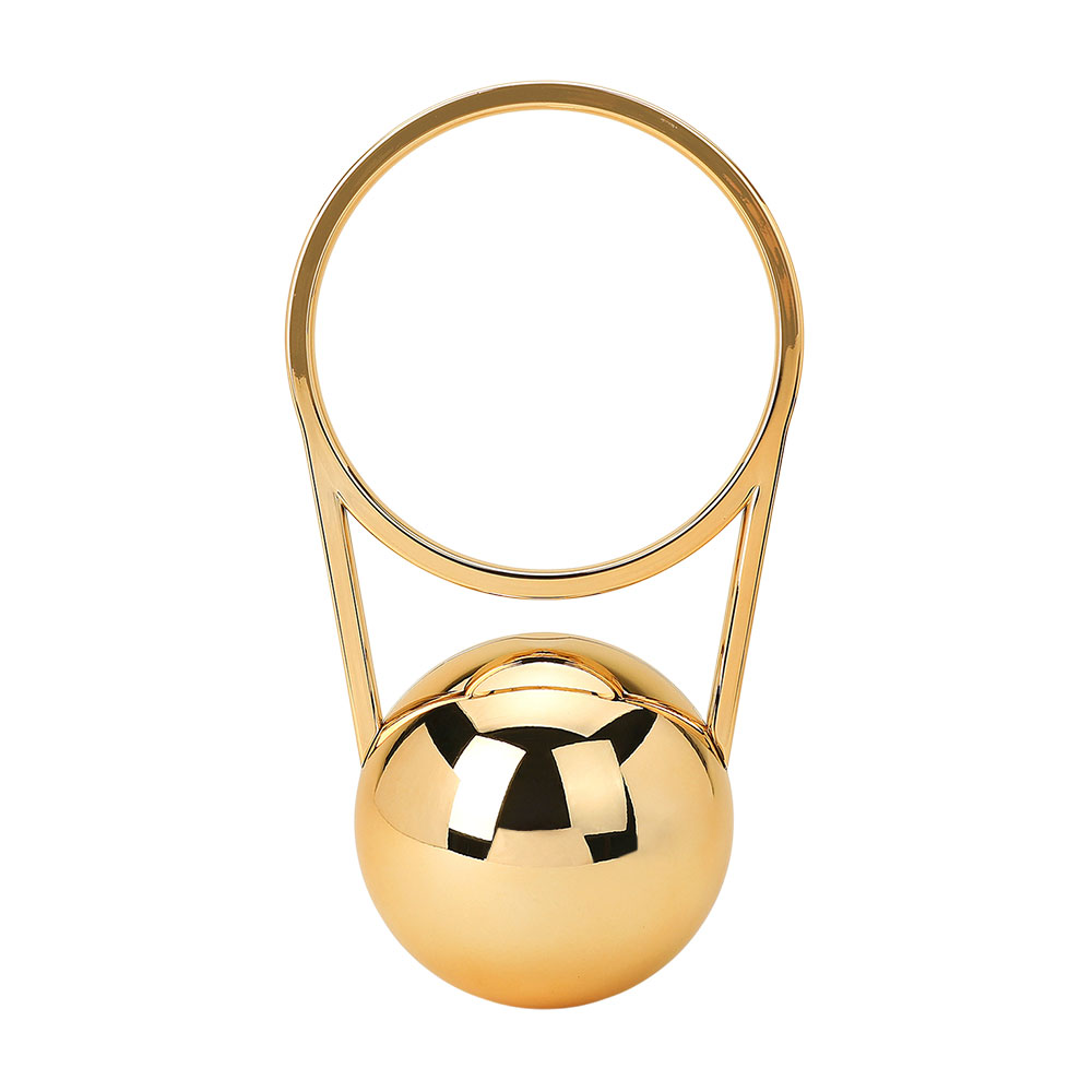 Details • Size : 5.5" X 10" X 4" • Magnetic Closure • This sculptural orb evening clutch showcases a sleek geometric design with a circular ring handle for a statement look. Its structured silhouette and polished finish bring a modern touch to formal and chic outfits, making it a standout accessory for special occasions.