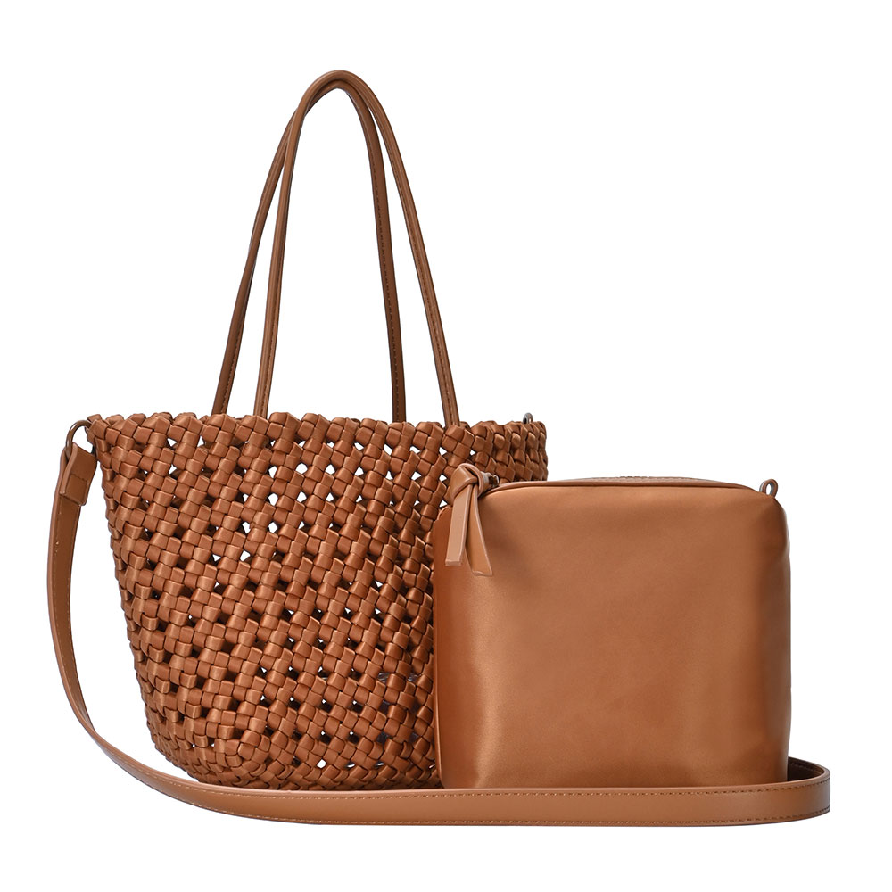 Details • Size : 10" X 7" X 4" • Top Handle Size : 7" L • Inside Pouch Size : 6" X 6" X 3" • Strap Size : 46" L / Detachable, Adjustable • One Inside Zipper Pocket • One Inside Slip Pocket • Zipper Closure • Material : Shell-Nylon, Lining-100%Polyester • Stylish woven tote bag featuring a detachable inner pouch and adjustable strap. Ideal for everyday, work, travel, or shopping. Combines elegance, versatility, and practical storage in one. • Handmade