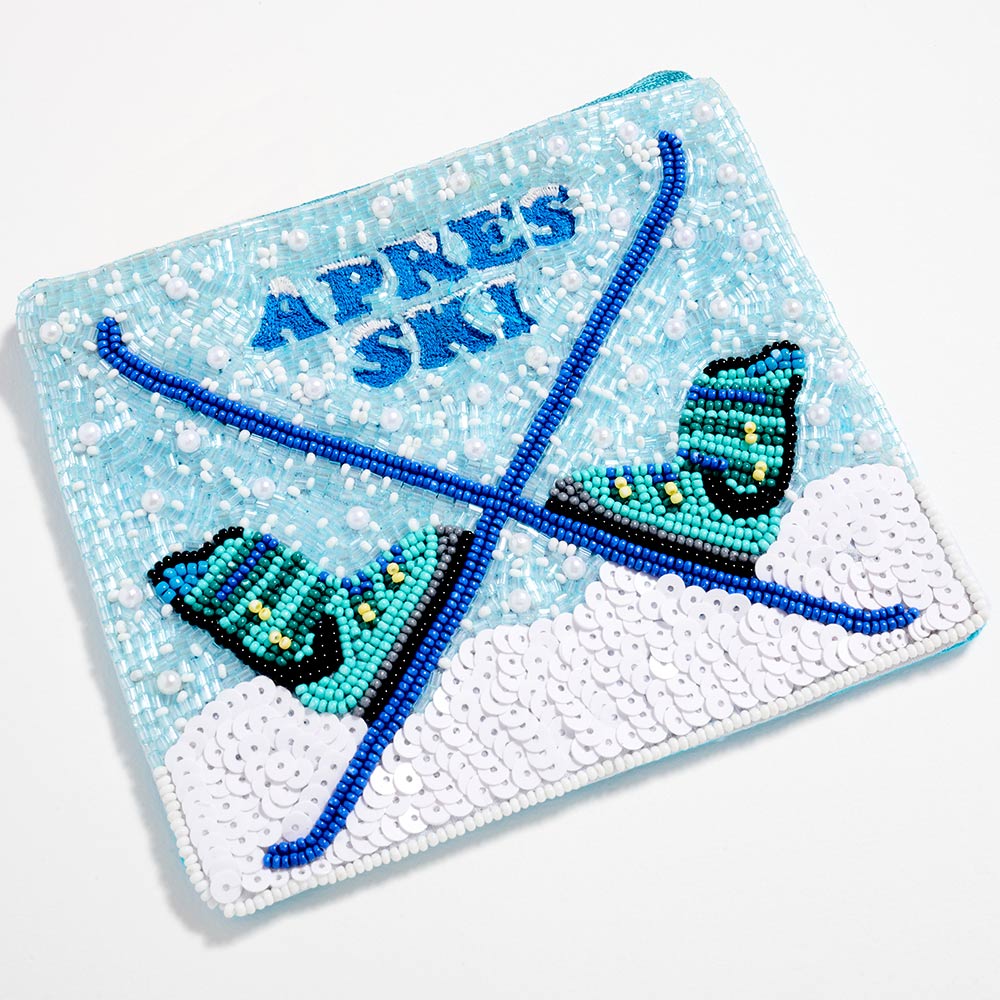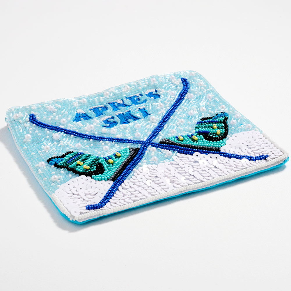 Details • Size : 5.5" X 4.5" (appx) • No Inside Pocket • Beads On Front Only • Bag Only (items are not included) • Zipper Closure • Statement zipper pouch featuring detailed beaded Apres Ski design, perfect for storing cosmetics, travel essentials, or small accessories. A fun, resort-inspired accessory ideal for seasonal displays, gift shops, and boutique collections, offering strong visual appeal and everyday practicality for trend-driven retail assortments. • Made In India