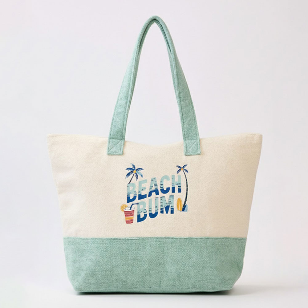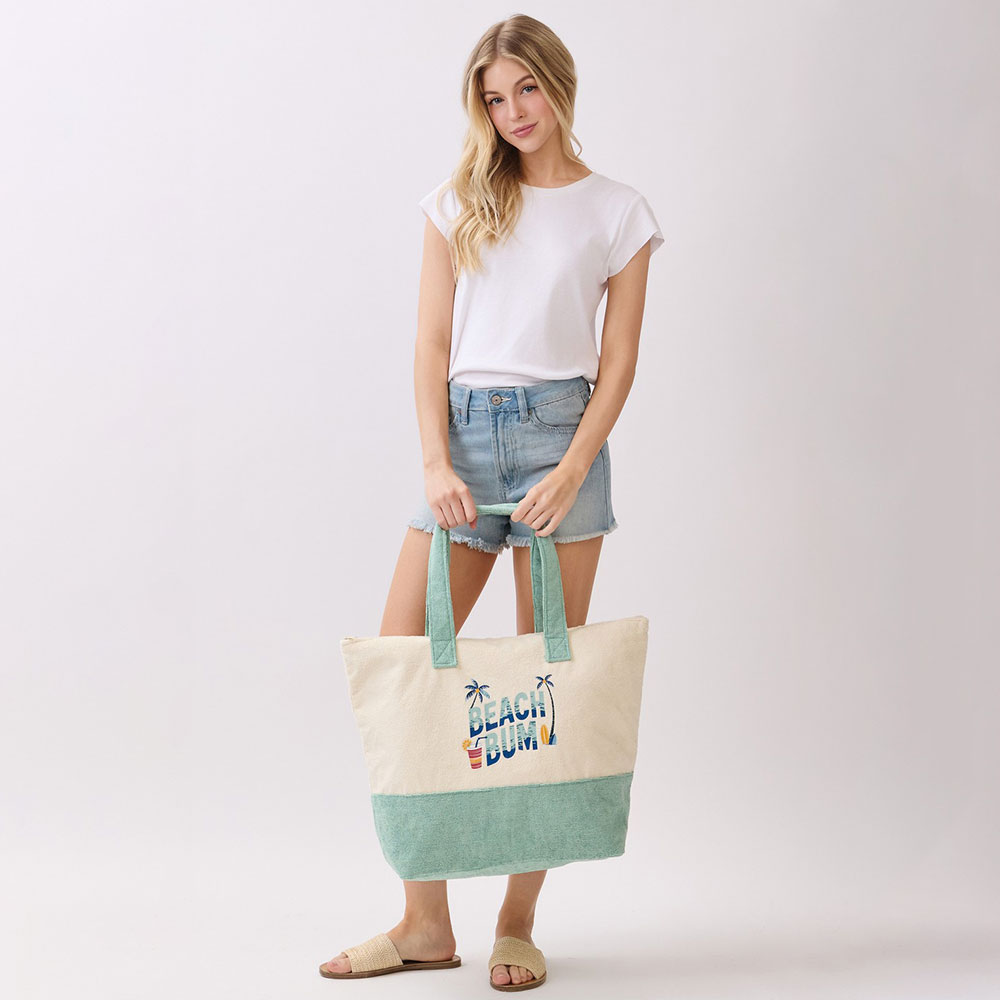 Details • Size : 22" X 16" X 6" • Inner Pocket • Zipper Closure • Material : 80% Polyester, 20% Polyamide • Relaxed beach themed tote bag featuring a fun “Beach Bum” graphic design. Perfect for beach trips, pool days, shopping, or vacation travel, this spacious carryall offers room for daily essentials while adding an easygoing coastal vibe to warm weather outfits.