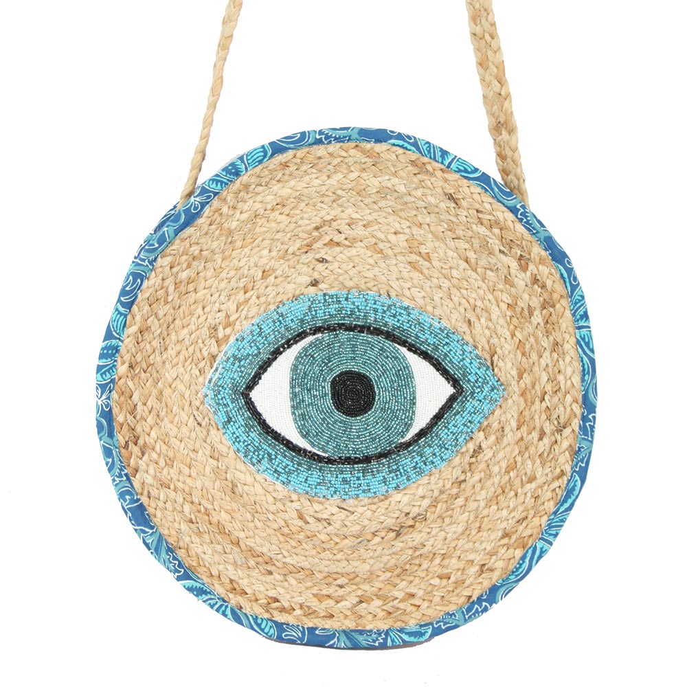 Details • Size : 14" X 15" X 3.75" • Strap Size : 18.5" L • Two Inside Slip Pockets • Zipper Closure • Statement round shoulder bag featuring a bold evil eye motif and structured woven silhouette. Designed to carry daily essentials with ease while adding a playful, protective-inspired accent to any outfit. Ideal for vacations, casual outings, and boutiques seeking eye-catching, trend-driven accessories. • Made In India
