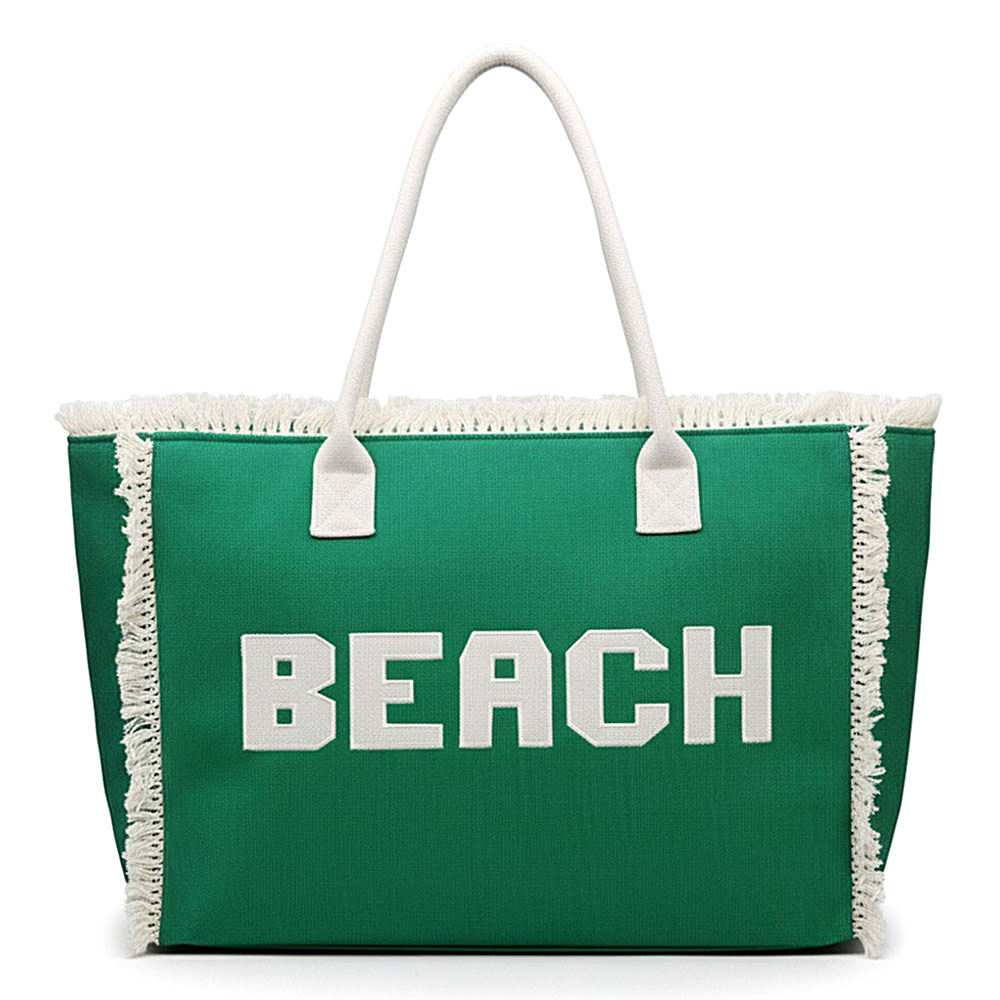 Bold BEACH Letter Embroidered Fringe Tote Bag