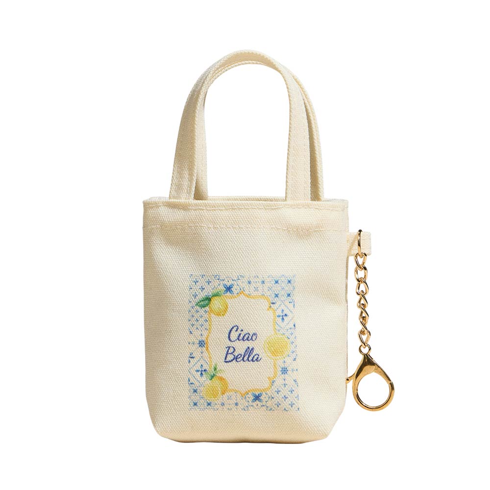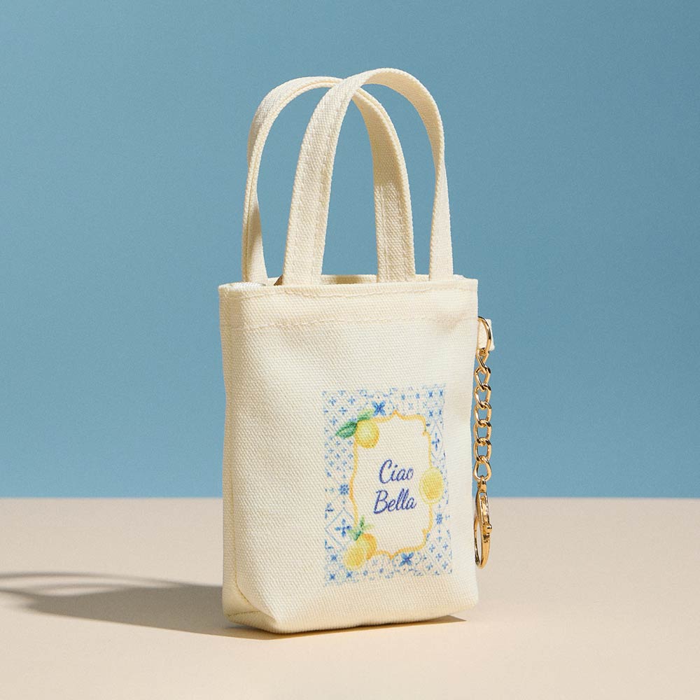 Details • Size : 4.25" X 5" • Strap Size : 2.5" L • Zipper Closure • Ciao Bella mini tote keychain bag featuring a charming graphic design and compact tote shape. Designed for holding small essentials while adding personality to keys, handbags, or backpacks. Ideal for gifting, travel themes, boutique displays, and novelty accessory collections with strong impulse-buy appeal.