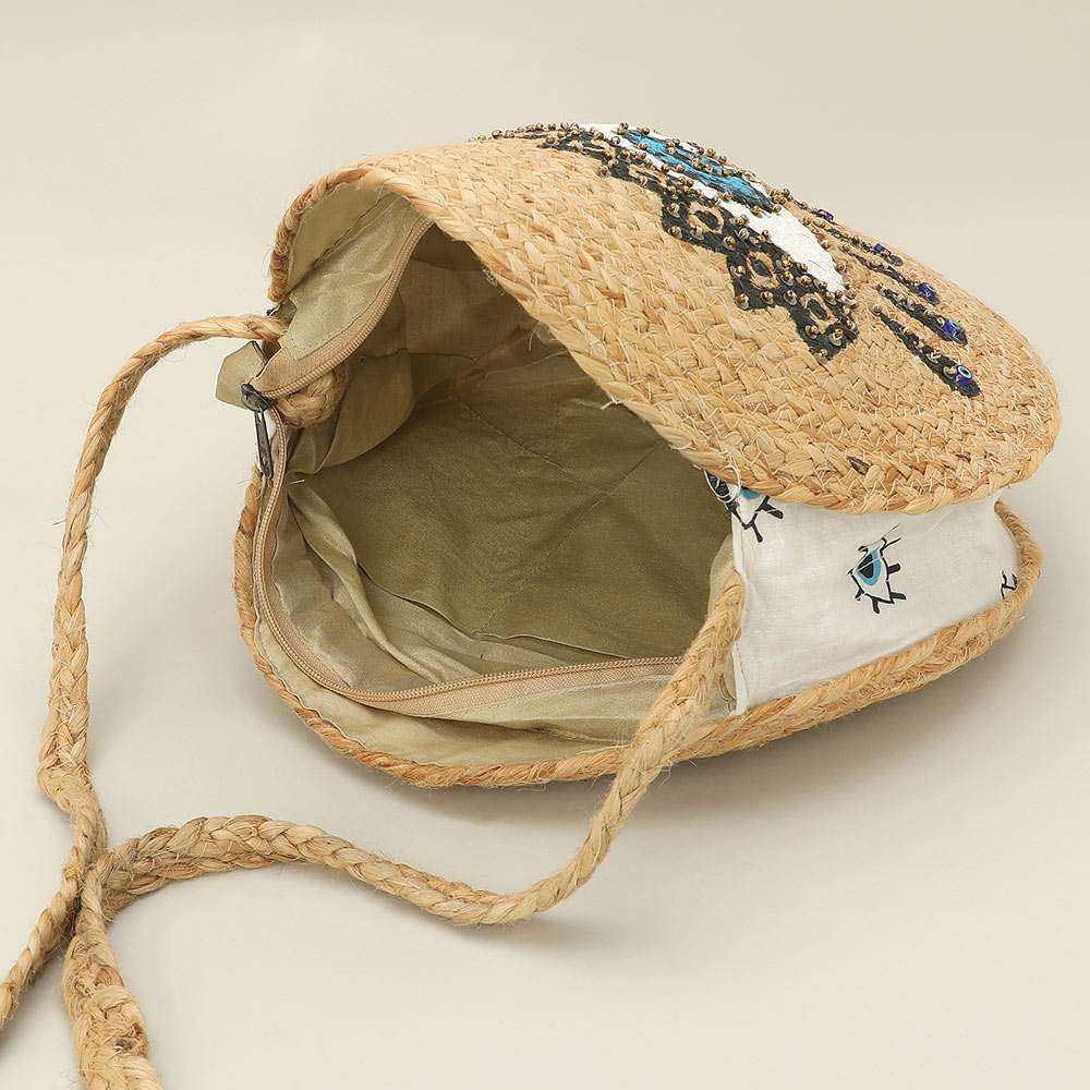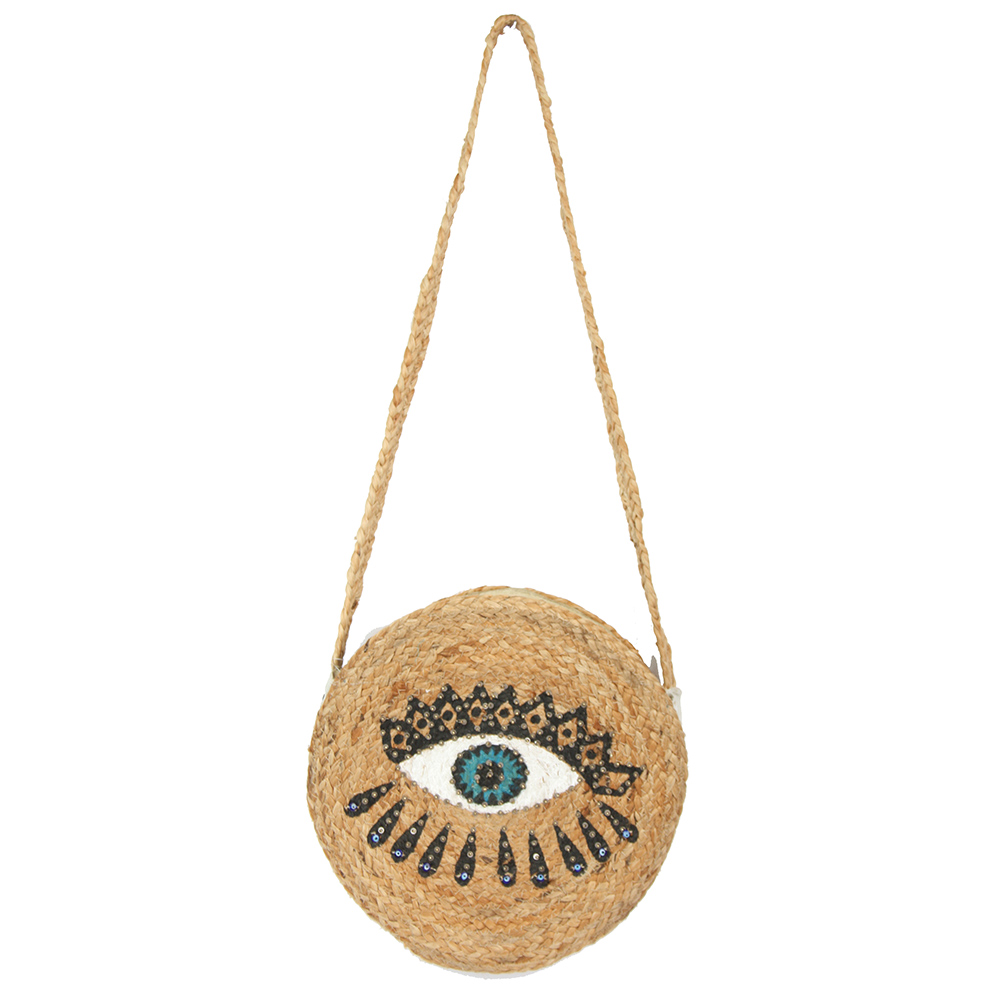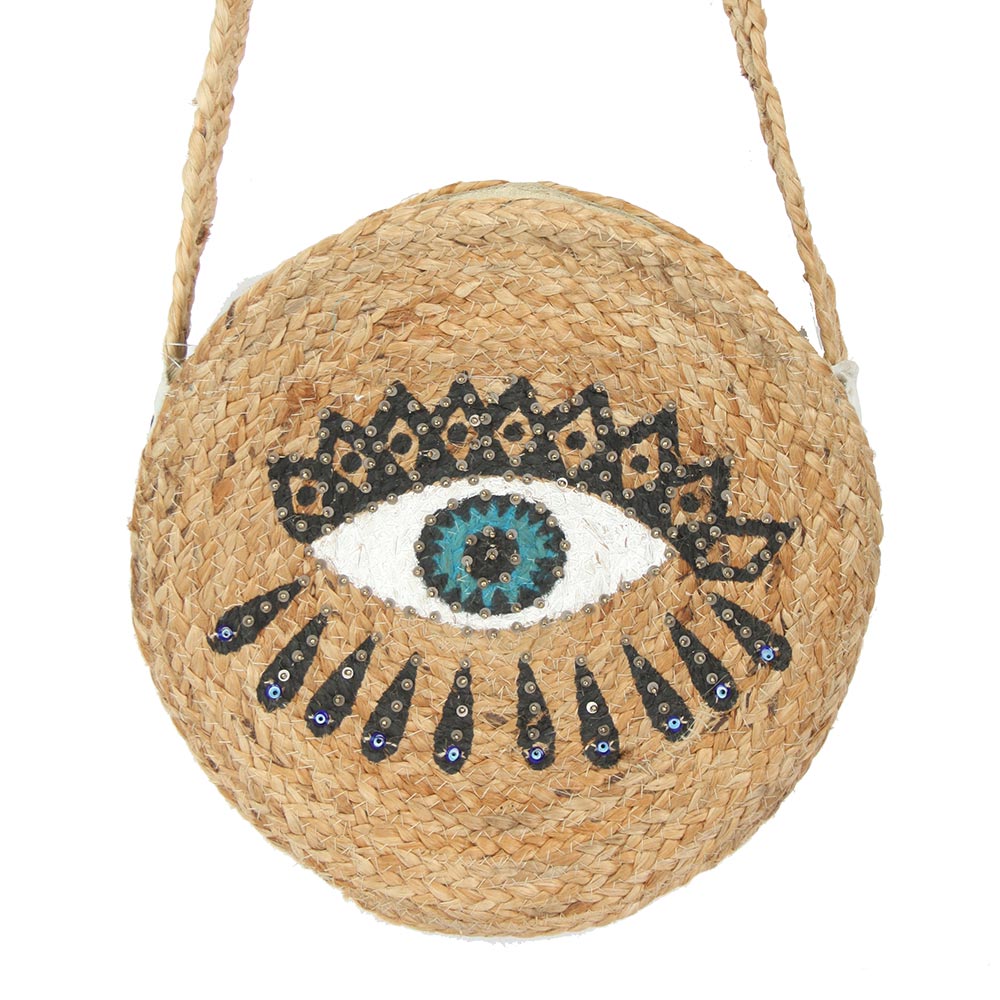 Evil Eye Accent Round Raffia Braided Crossbody Bag