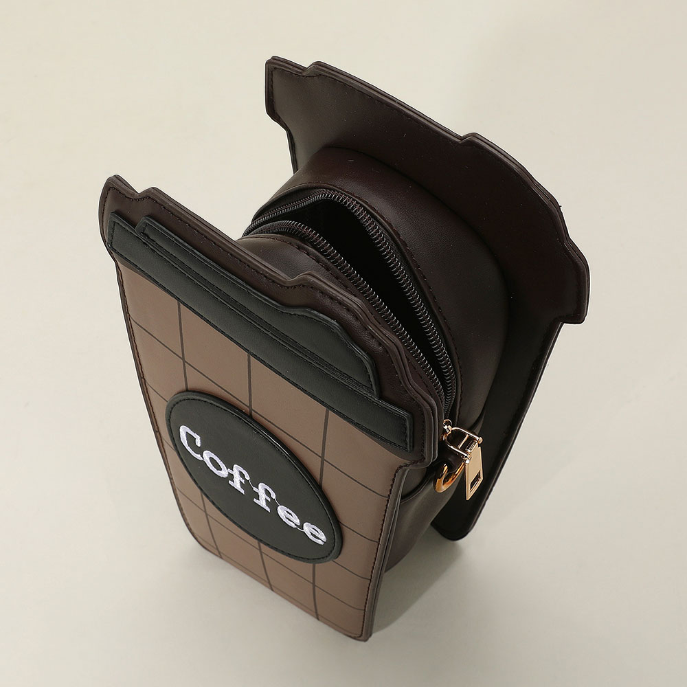 • Fun and stylish coffee cup shaped crossbody bag featuring a grid design, bold "Coffee" print, and a sleek chain strap. A quirky and eye-catching accessory ideal for cafĂ© lovers and trendsetters.