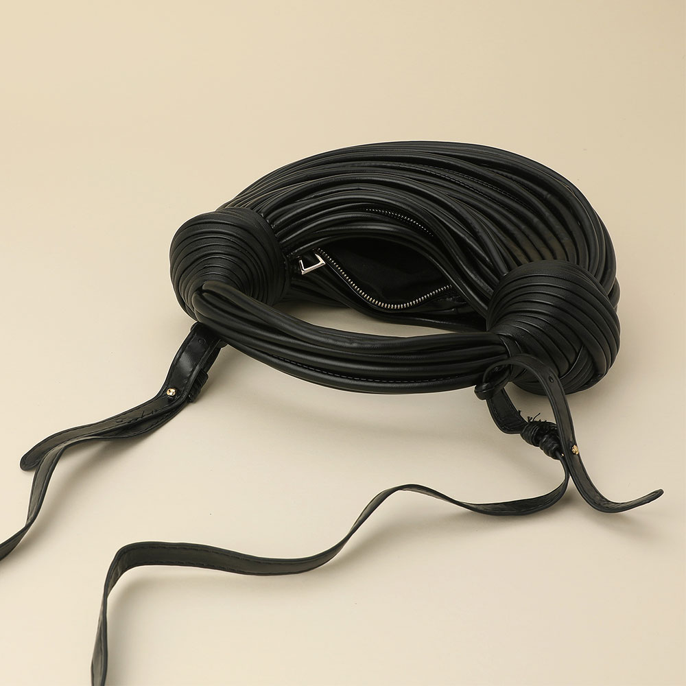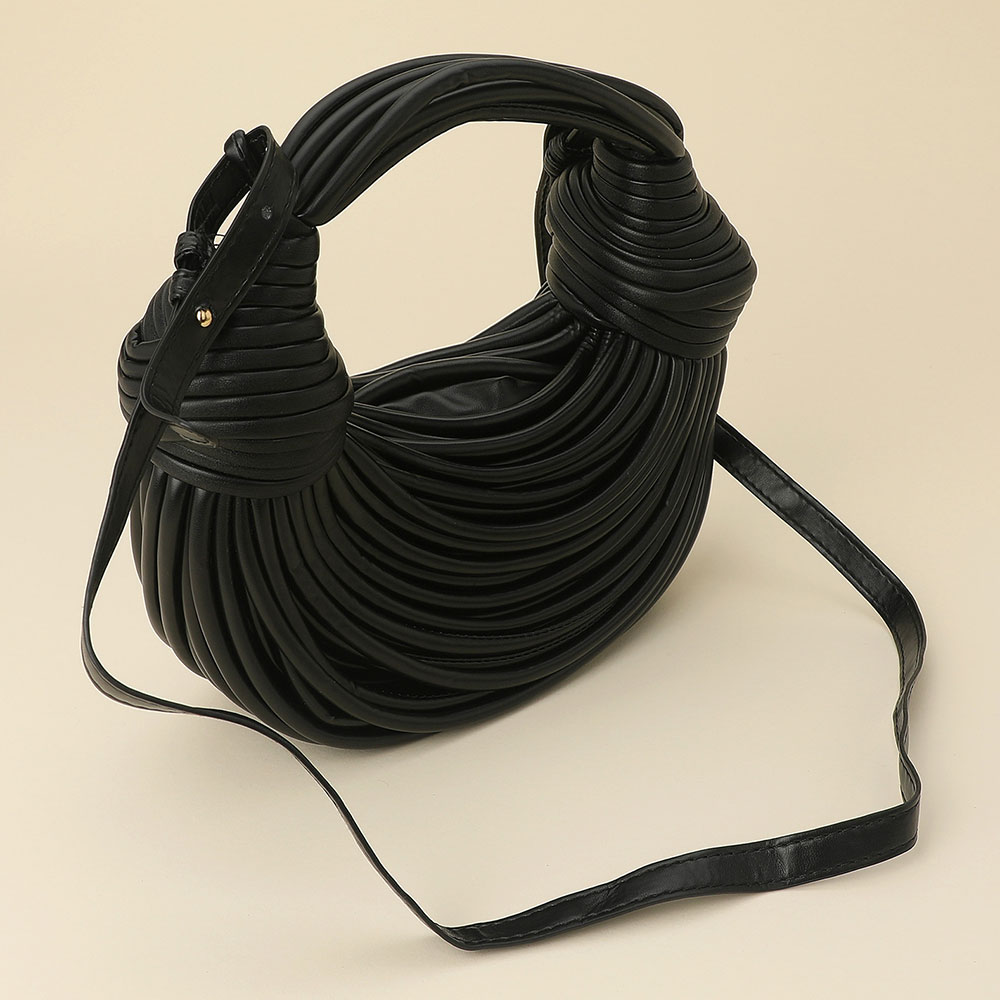 Details • Size : 11" X 4" X 3" • Top Handle Size : 5" L • Strap Size : 40" L / Adjustable, Detachable • Zipper Closure • Stand out with this textured statement shoulder bag featuring a sculpted design and intricate wrapped detailing. Its modern silhouette and artistic structure make it a versatile piece that adds a touch of high-fashion sophistication to any day or evening ensemble.