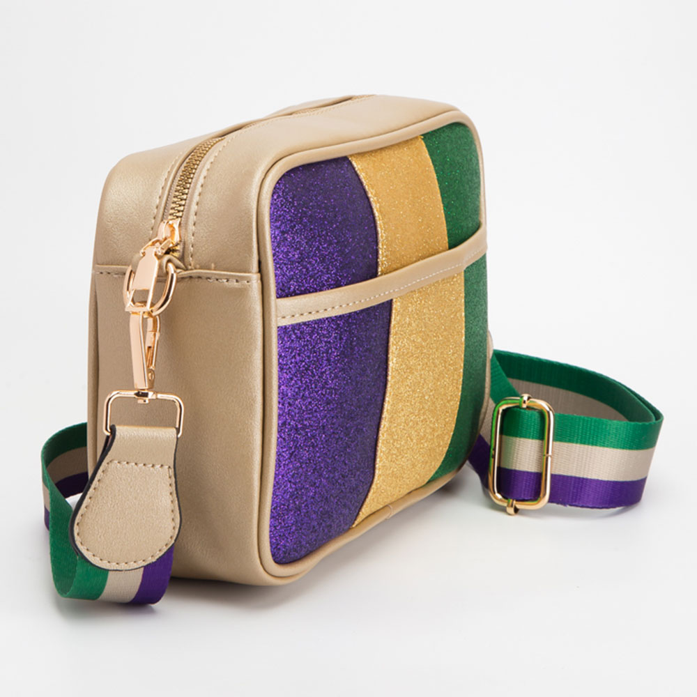 Details • Size : 9.8" X 6.7" X 2.75" • Strap Size : Adjustable / Detachable • One Outside Slip Pocket • One Inside Slip Pocket • One Inside Zipper Pocket • Zipper Closure • Glitter crossbody bag with festive Mardi Gras colors and a detachable strap. Roomy, lightweight, and parade-ready—perfect for hands-free celebration.