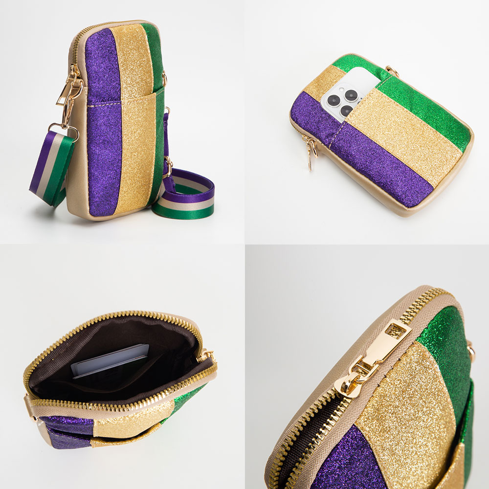 Faux Leather Mardi Gras Sparkle Front Small Crossbody Bag