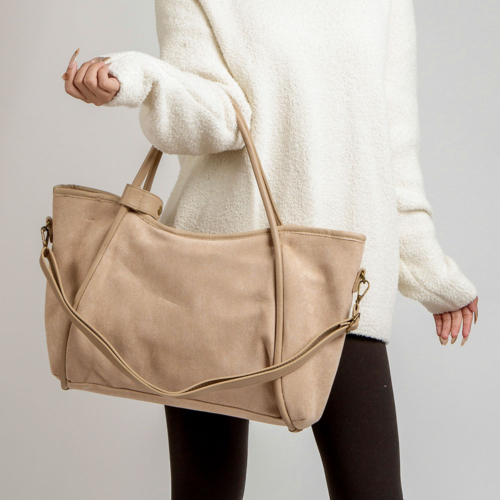 • This suede-style tote bag blends elegance with practicality, featuring dual handles for easy carrying and a roomy interior to keep essentials organized. A versatile design that transitions seamlessly from work to casual outings while adding a touch of sophistication.