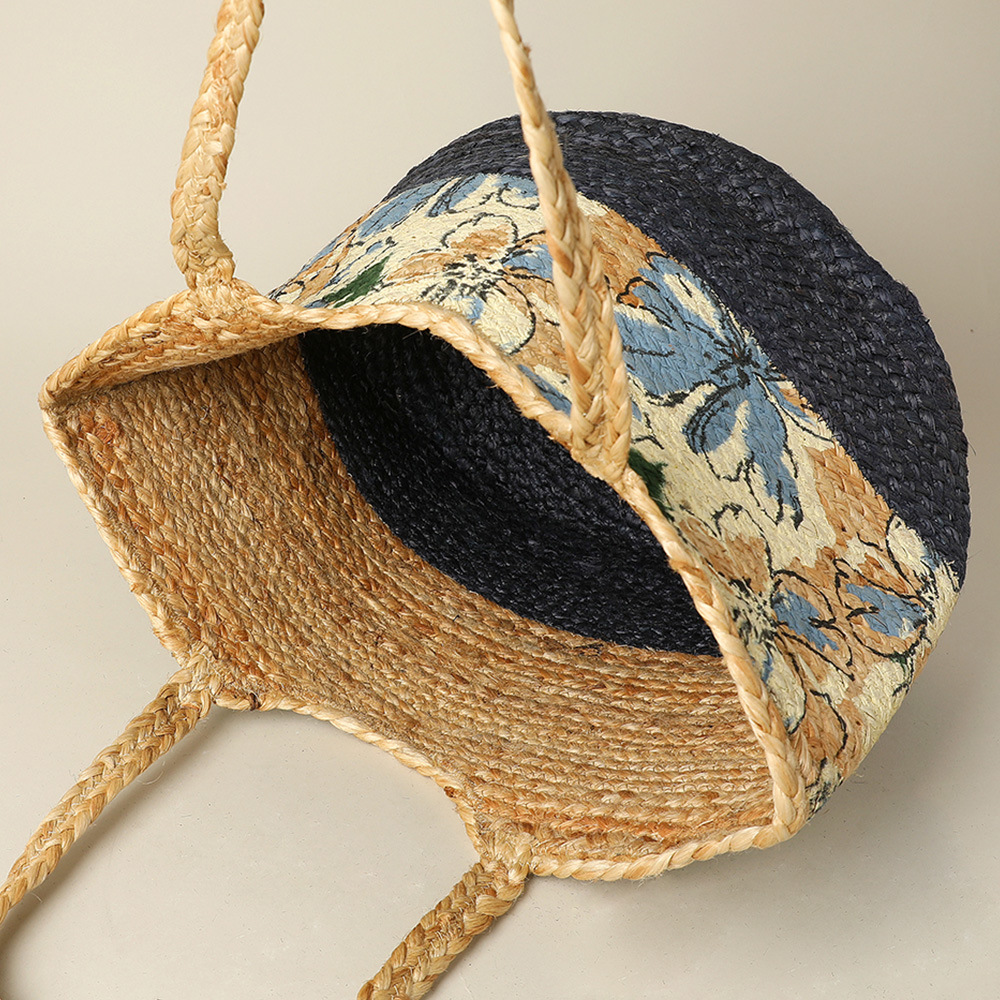 Floral Pattern Two Tone Woven Straw Shoulder Bag / Tote Bag