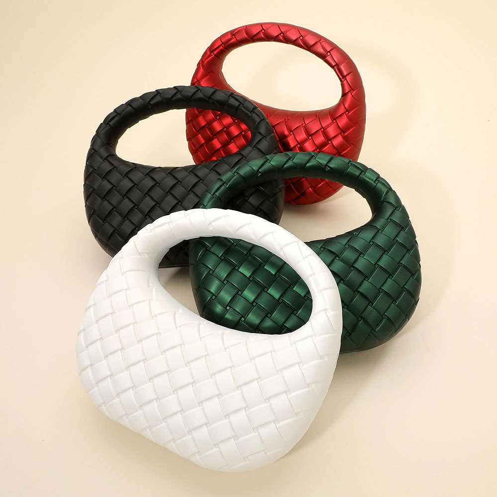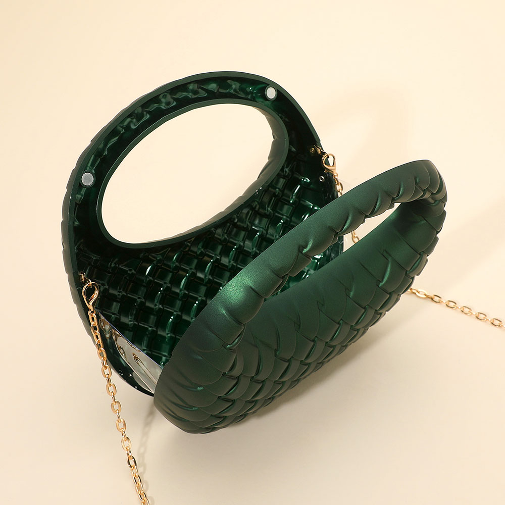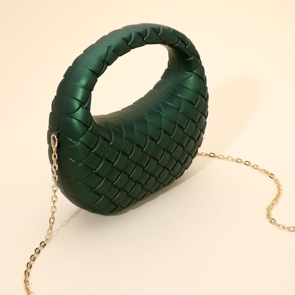 • A stylish woven-pattern evening clutch designed with a sculpted handle and a sleek silhouette. The compact shape offers modern sophistication, while the detachable chain strap adds versatile wear for special events, nights out, and elegant occasions.