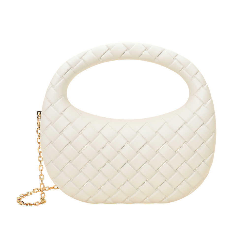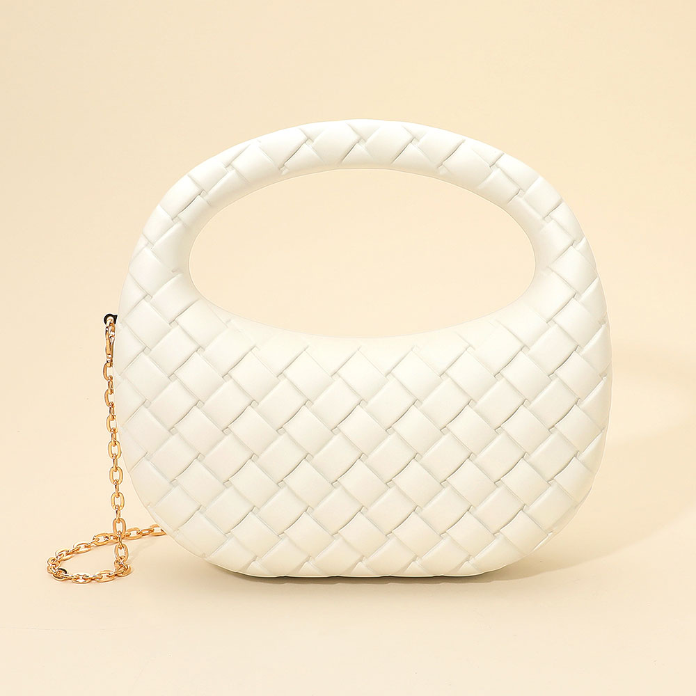 Details • Size : 8.5" X 4" X 2.75" • Top Handle Size : 3.75" L • Strap Size : 46" L / Detachable • Magnetic Closure • A stylish woven-pattern evening clutch designed with a sculpted handle and a sleek silhouette. The compact shape offers modern sophistication, while the detachable chain strap adds versatile wear for special events, nights out, and elegant occasions.
