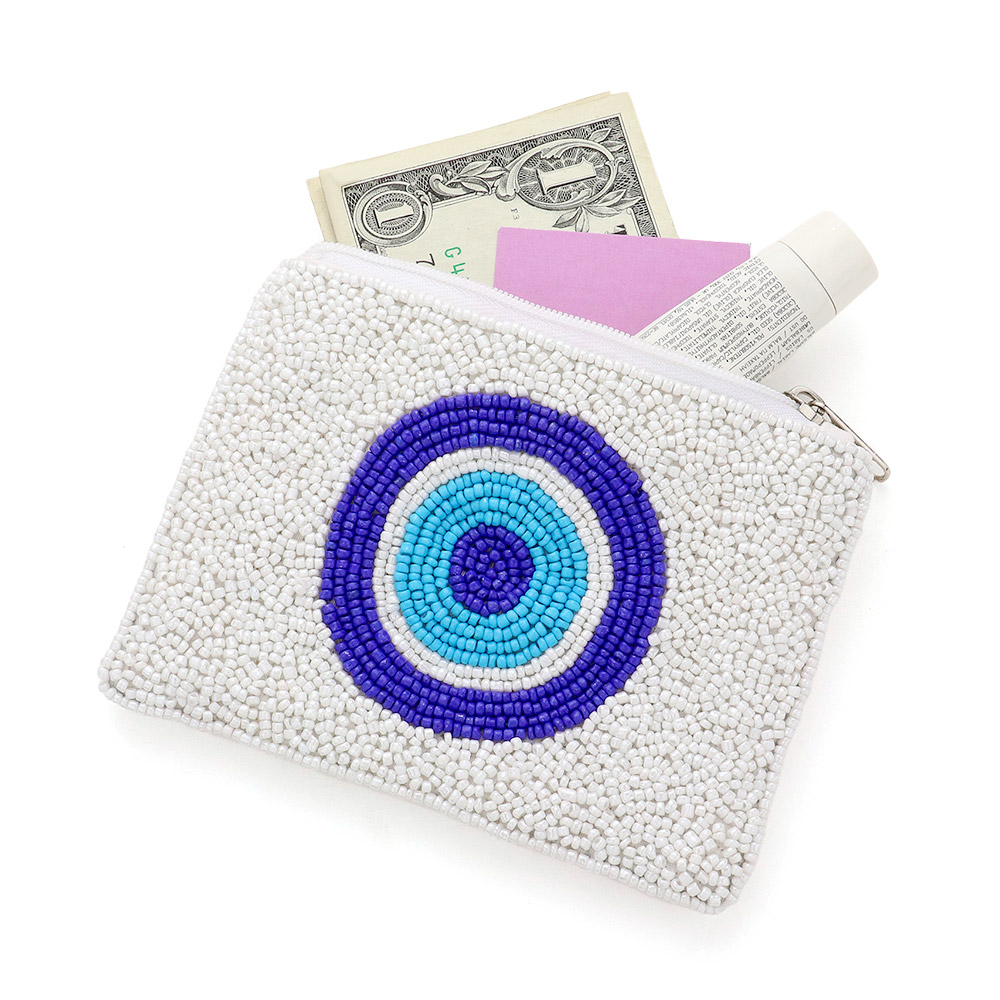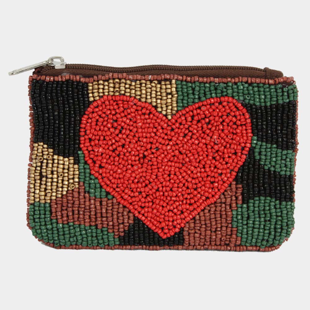 Heart Accented Camouflage Patterned Seed Beaded Mini Pouch Bag