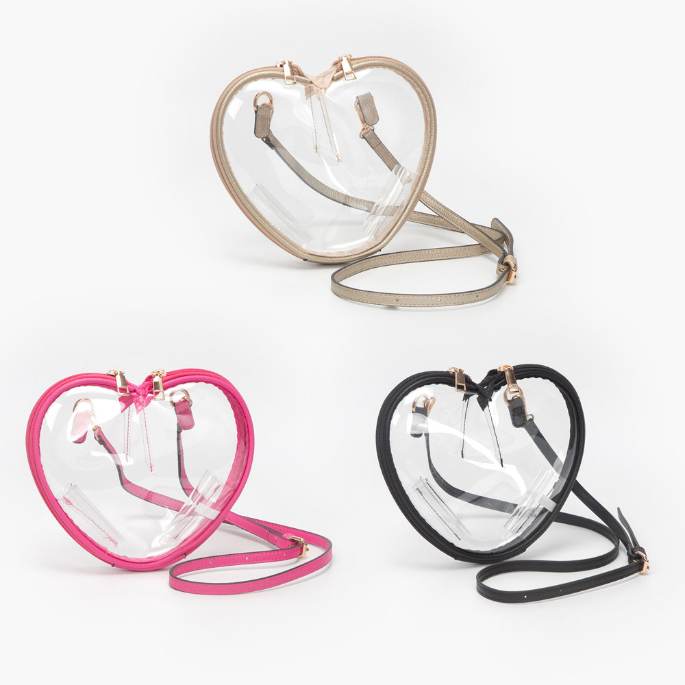 Details • Size : 8" X 8" X 3" • Strap Size : 47" L / Detachable, Adjustable • Stylish heart-shaped clear crossbody bag designed for concerts, events, and everyday outings. Compact yet practical for carrying essentials while staying hands-free. The transparent design meets venue requirements and adds a trendy statement to any casual or festive look.
