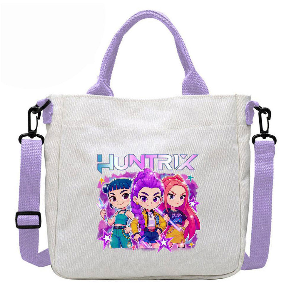 Details • Size : 9.5" X 9" X 2.25" • Top Handle Size : 3.5" L • Strap Size : 41" L / Detachable, Adjustable • Magnetic Closure • Material : 100% Polyester • Stylish tote bag featuring bold HUNTR/X character artwork with a practical carry design ideal for daily errands, shopping, events, conventions, or casual outings. Lightweight and spacious enough for essentials, making it a versatile accessory for fans and everyday use.