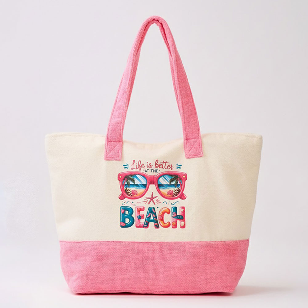 Details • Size : 22" X 16" X 6" • Inner Pocket • Zipper Closure • Material : 80% Polyester, 20% Polyamide • Beach inspired graphic tote bag featuring a fun “Life Is Better at the Beach” design. Perfect for seaside trips, pool days, shopping, or vacation travel, this spacious carryall holds daily essentials while adding a relaxed, sunny vibe to summer outfits and getaway adventures.