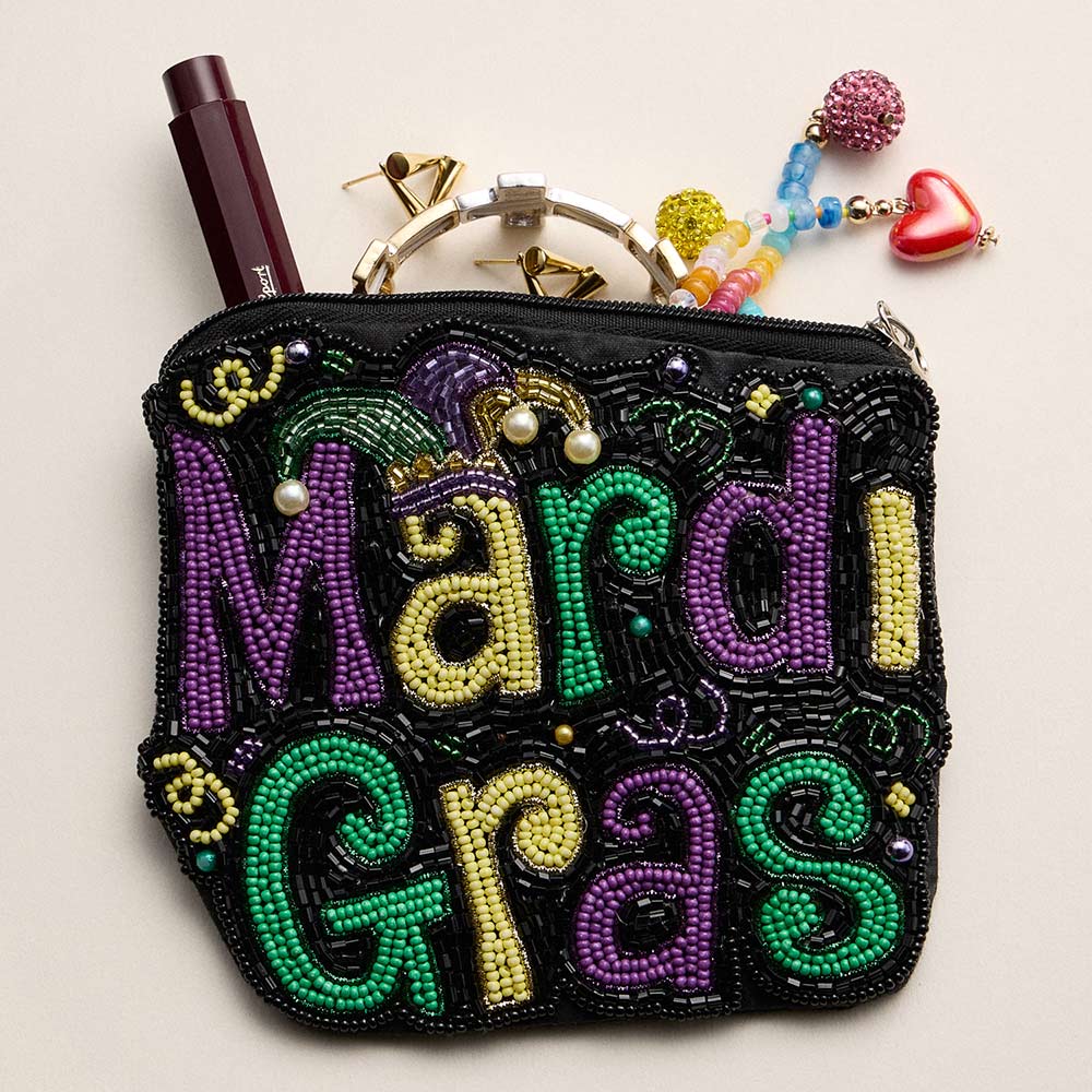 Details • Size : 5.25" X 4.5" (appx) • No Inside Pocket • Beads On Front Only • Bag Only (items are not included) • Zipper Closure • Eye-catching zipper pouch featuring bold Mardi Gras lettering with intricate beadwork, designed for storing cosmetics, accessories, or small essentials. A festive statement accessory ideal for seasonal assortments, gift shops, and boutique displays, offering playful style, strong shelf appeal, and everyday functionality for celebration-focused retail collections. • Made In India