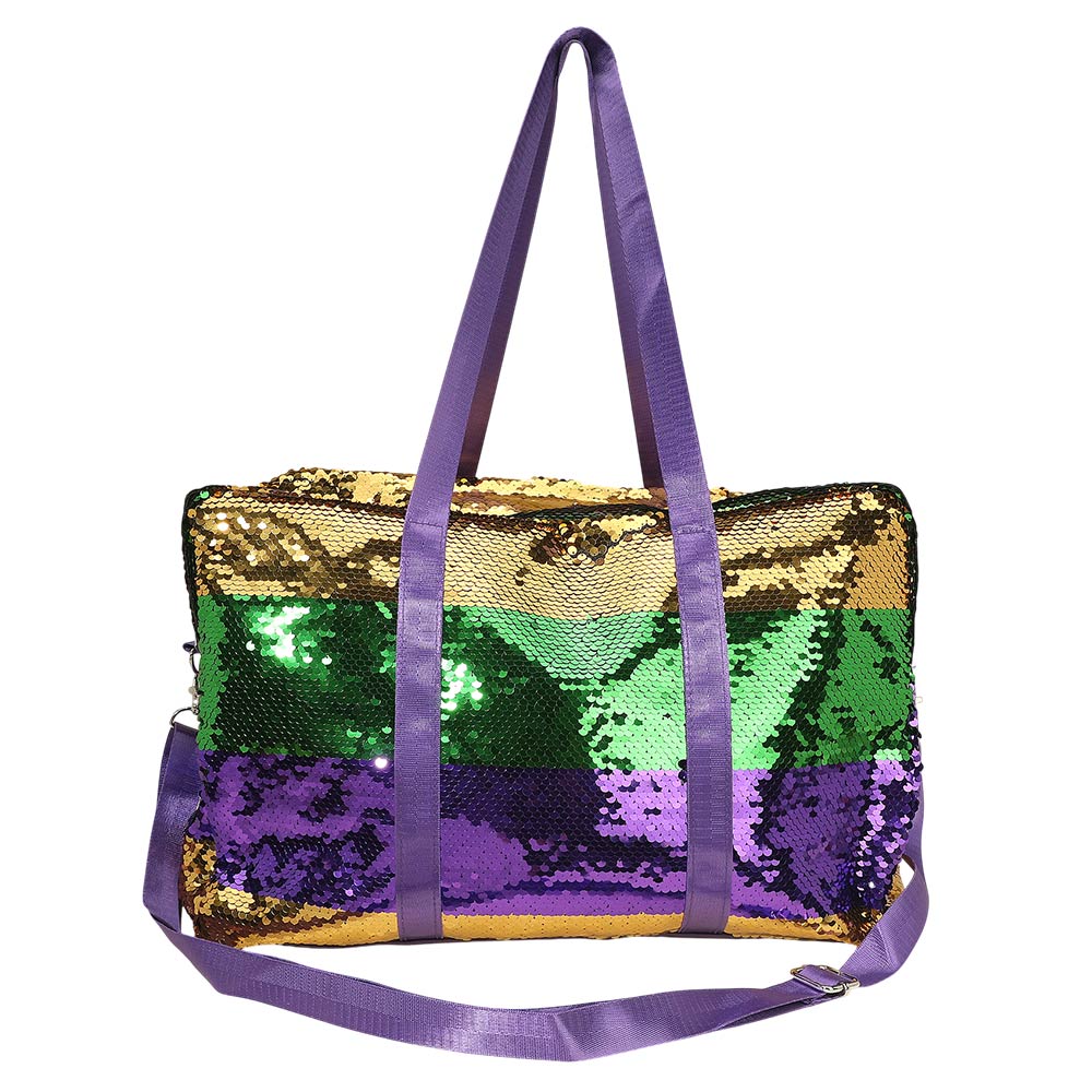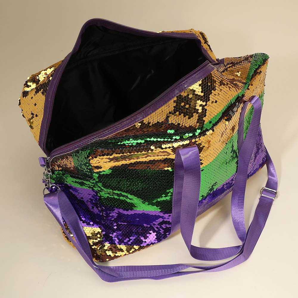Details • Size : 16.75" X 11.75" X 6.5" • Top Handle Size : 11" L • Strap Size : 59" L • Zipper Closure • Statement duffle tote bag designed for travel, events, and weekend use. Features a spacious main compartment, dual carry handles, and an adjustable shoulder strap for versatile wear. Ideal for festival styling, themed celebrations, gifting, or boutique displays with eye catching texture and bold fashion appeal.