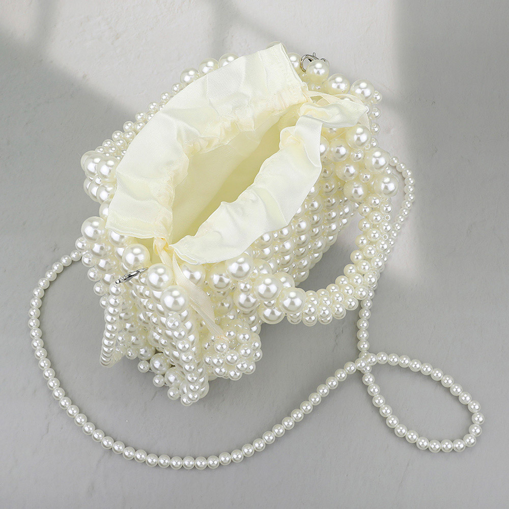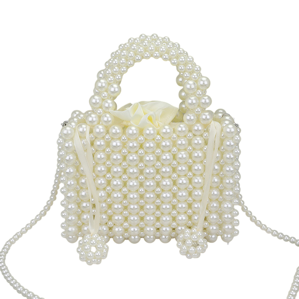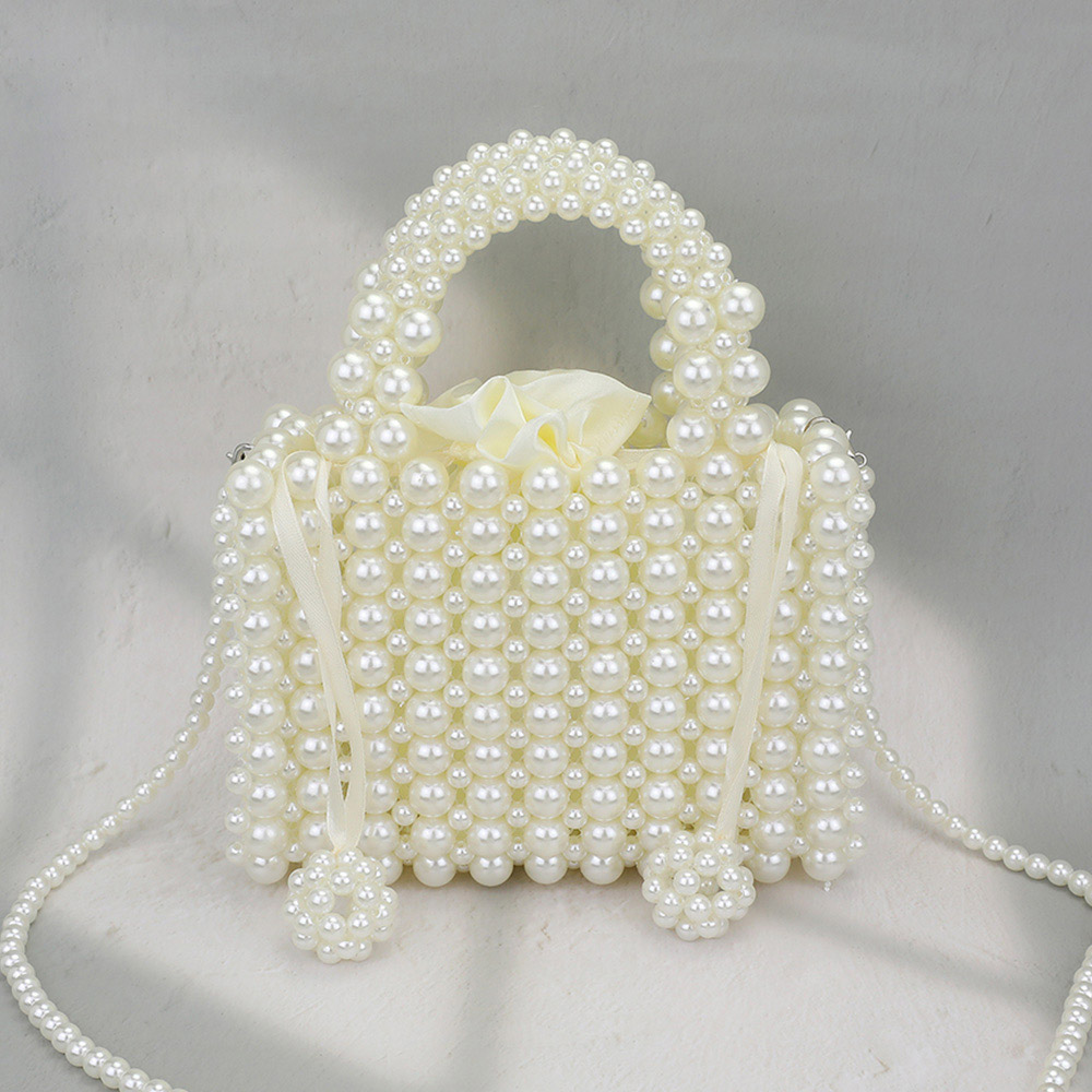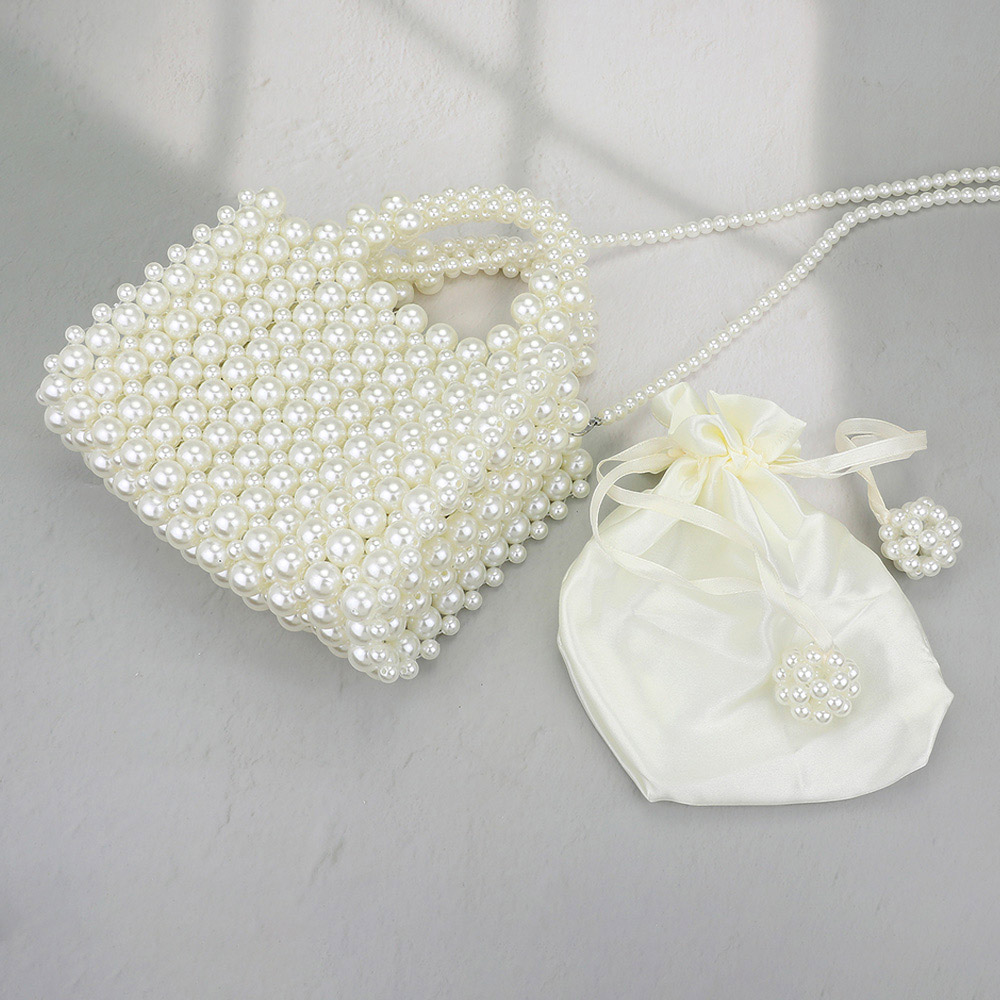 Details • Size : 7" X 5" X 2" • Top Handle Size : 2.5" L • Strap Size : 44" L / Detachable, Adjustable • Inside Pouch Size : 5" X 6.75" • Chic mini handbag featuring a structured pearl beaded exterior, dual handles, and a soft drawstring pouch. Ideal for weddings, parties, or formal events, it adds a refined and unique flair to any ensemble.