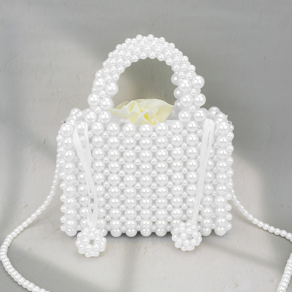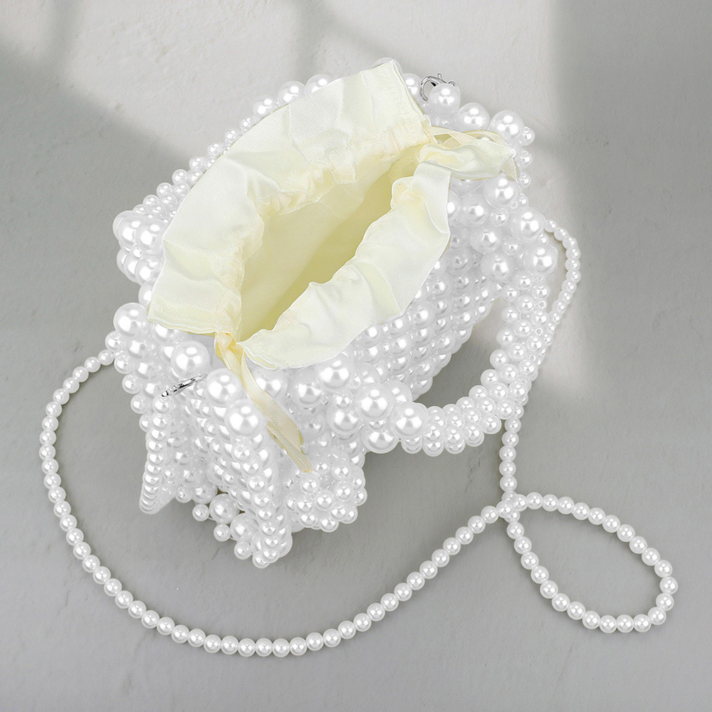 Details • Size : 7" X 5" X 2" • Top Handle Size : 2.5" L • Strap Size : 44" L / Detachable, Adjustable • Inside Pouch Size : 5" X 6.75" • Chic mini handbag featuring a structured pearl beaded exterior, dual handles, and a soft drawstring pouch. Ideal for weddings, parties, or formal events, it adds a refined and unique flair to any ensemble.