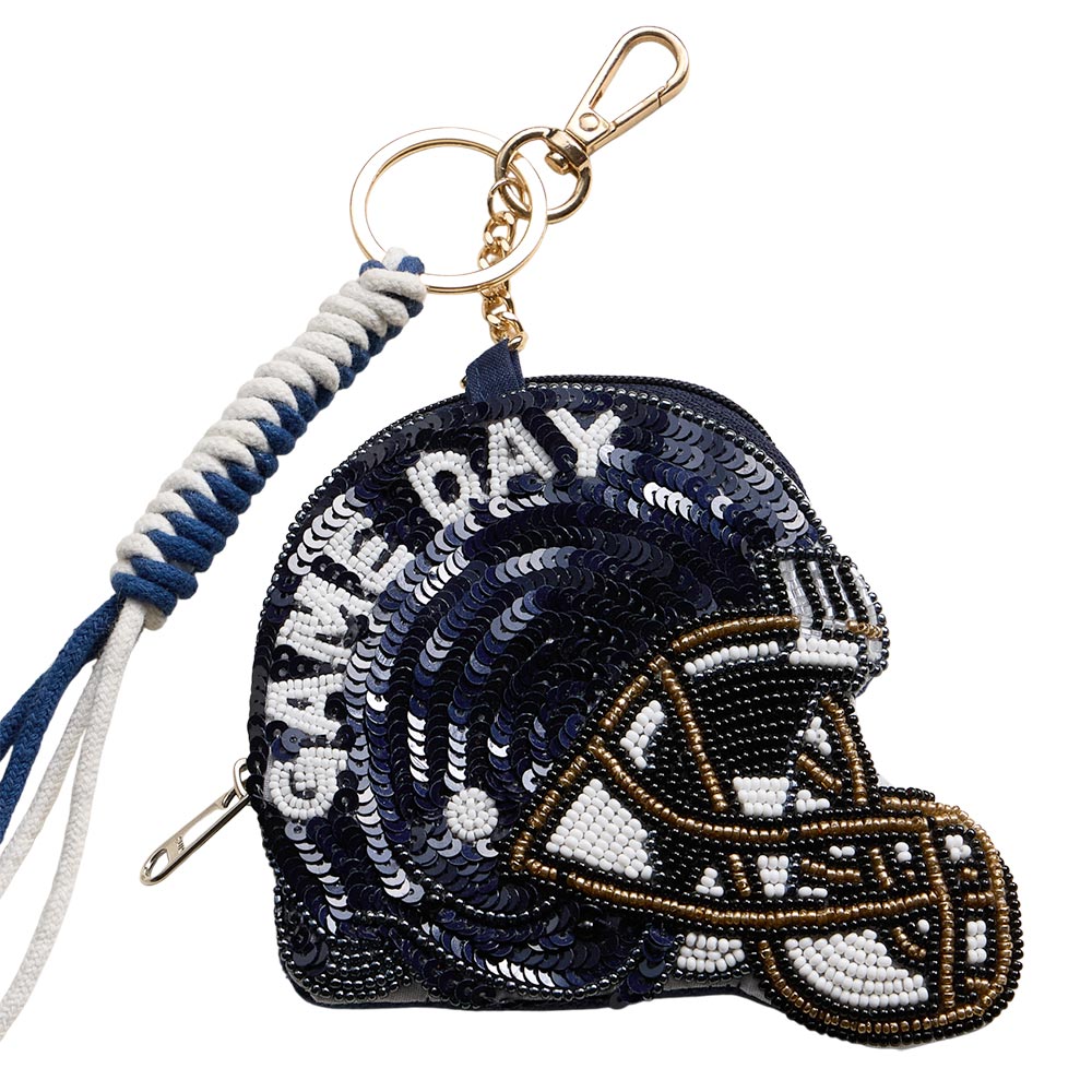 Details • Size : 4.5" X 4.75" (appx) • Decor Size : 9" L • No Inside Pocket • Beads On Front Only • Bag Only (items are not included) • Zipper Closure • Eye-catching helmet-shaped keychain pouch designed with detailed beadwork and zip closure for small essentials. Perfect for game day displays, sports-themed collections, gifting, and impulse buys, this compact accessory adds playful personality while offering practical storage on the go. • Made In India