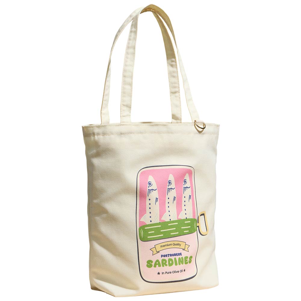 Details • Size : 14.5" X 14.5" • Top Handle Size : 8" L • Playful sardines graphic tote bag designed for everyday use and easy styling. Features comfortable shoulder straps and a spacious interior ideal for shopping, travel, beach days, or casual outings. A fun, novelty-inspired tote that adds personality to gift shops, boutiques, and seasonal lifestyle collections.