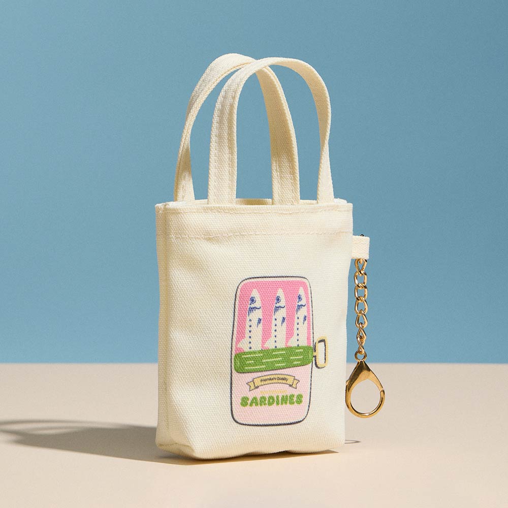 Details • Size : 4.25" X 5" • Strap Size : 2.5" L • Zipper Closure • Sardines mini tote keychain bag designed as a playful novelty accessory for keys, charms, and small essentials. Features a compact tote shape with top handles and attached keyring, perfect for bags, backpacks, gifting, summer themes, travel collections, and impulse-buy displays in boutique and lifestyle retail settings.