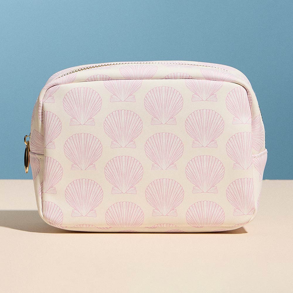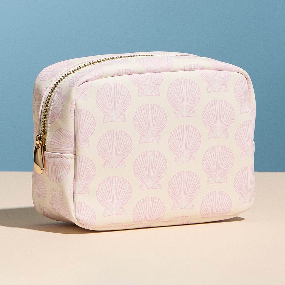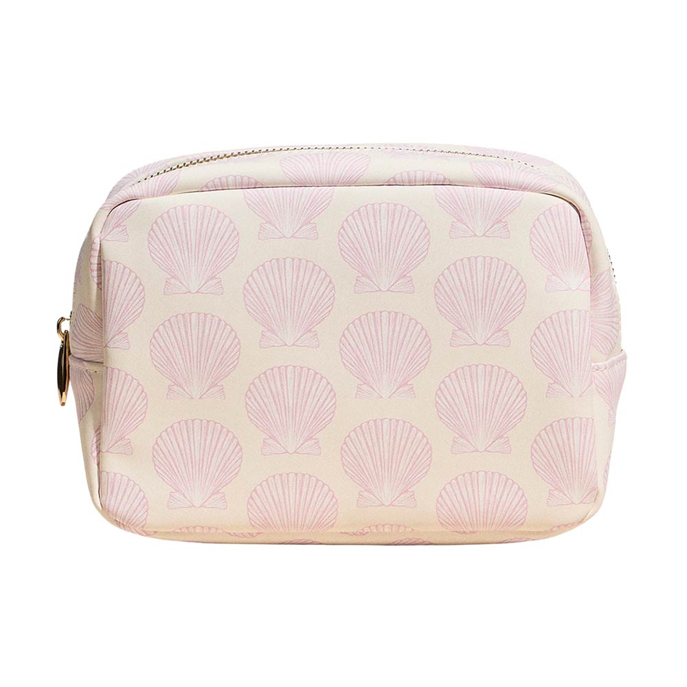 Details • Size : 7" X 5" X 2.5" • Zipper Closure • Stylish shell pattern cosmetic pouch designed for storing makeup, skincare, and small essentials. Features a structured silhouette with secure zip closure and spacious interior for everyday organization. Ideal for travel, handbags, or vanity storage, and perfect as a practical gift accessory.