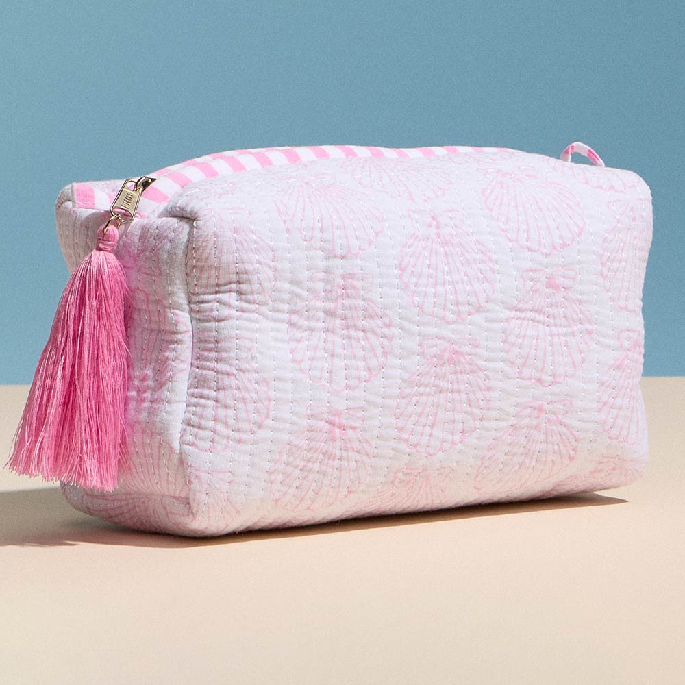 Details • Size : 6.5" X 4" X 3" • Zipper Closure • Quilted shell pattern cosmetic pouch designed for organizing makeup, toiletries, and small daily essentials. Features a softly padded structure, smooth zip closure, and tassel accent for added style. Compact yet roomy for travel, handbags, or vanity storage, making it a charming and practical accessory or gift option.