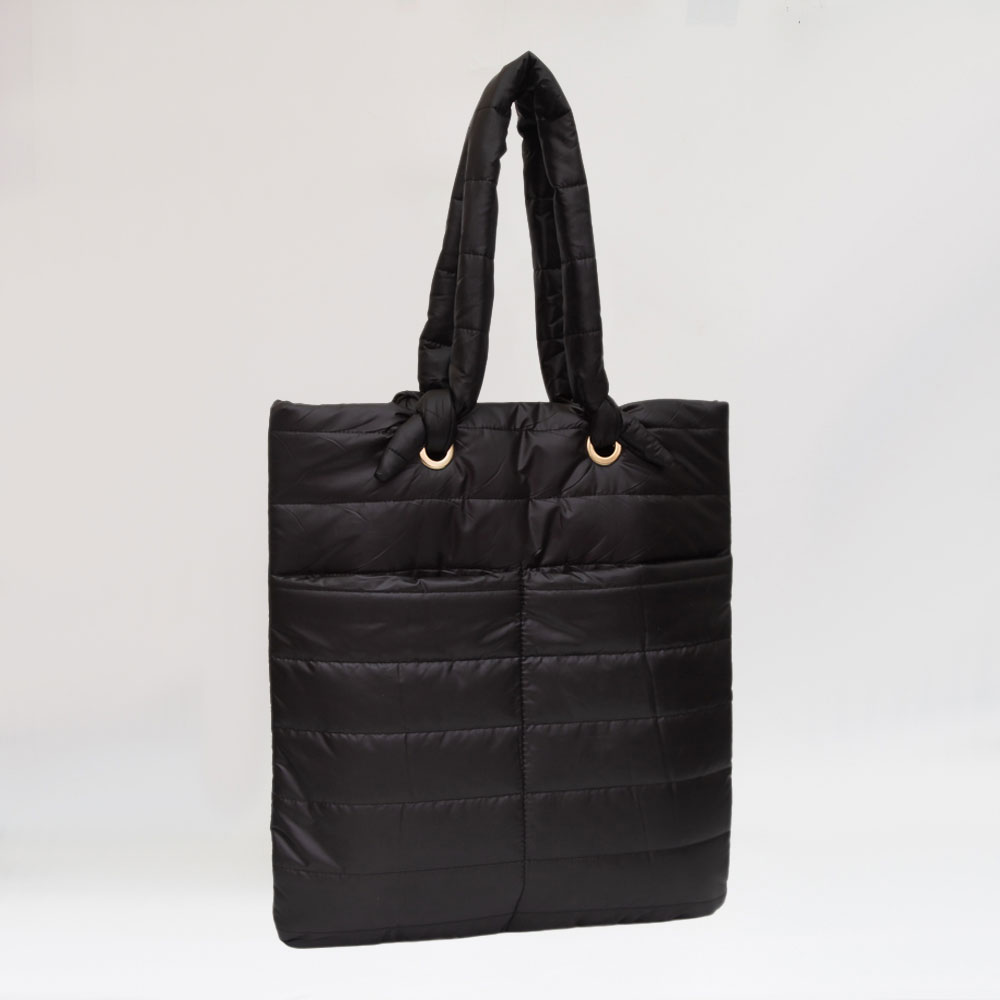 • A lightweight quilted tote bag featuring a sleek padded finish, roomy interior, and comfortable handles for effortless everyday carry. Its clean, modern silhouette makes it ideal for work, errands, or travel while adding a refined, cozy touch to any outfit.