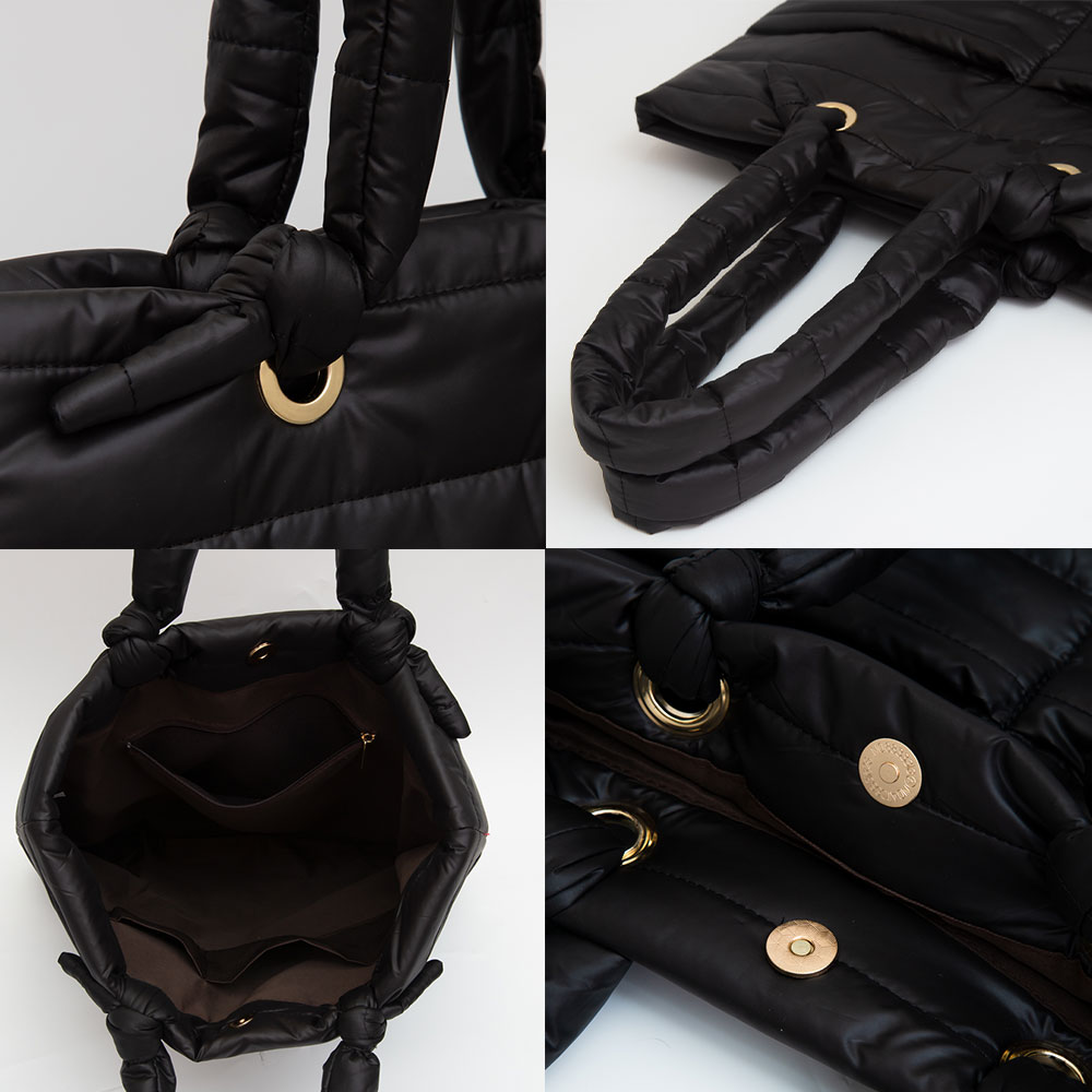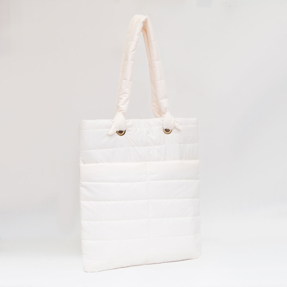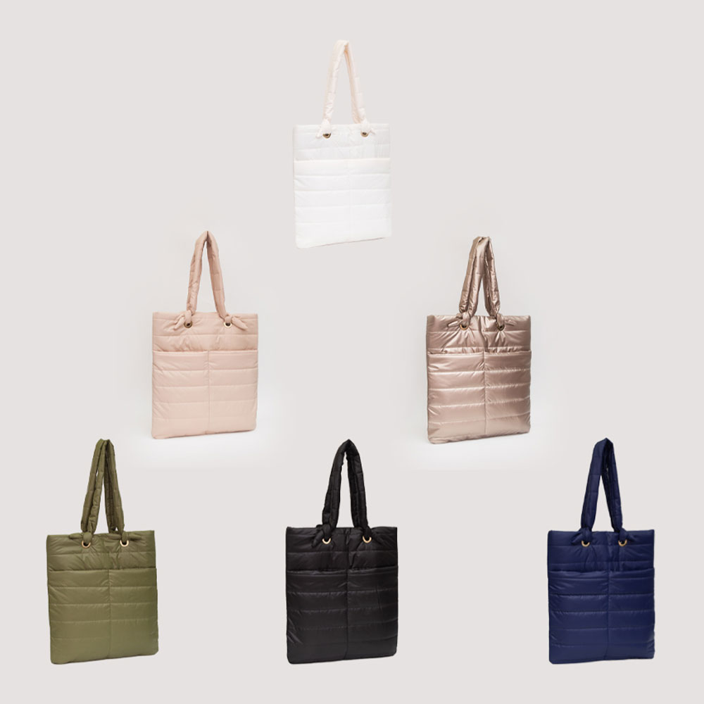 • A lightweight quilted tote bag featuring a sleek padded finish, roomy interior, and comfortable handles for effortless everyday carry. Its clean, modern silhouette makes it ideal for work, errands, or travel while adding a refined, cozy touch to any outfit.