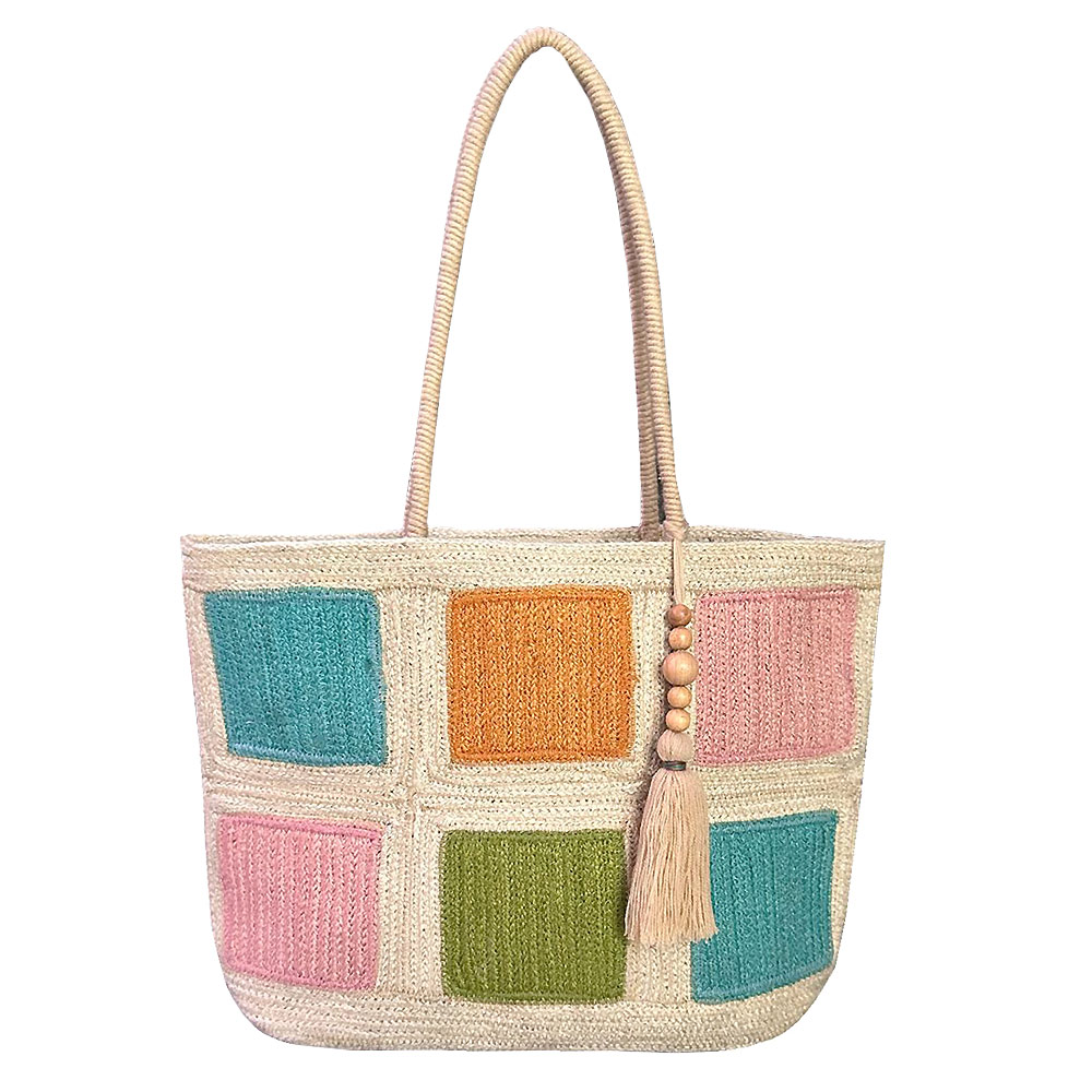 Details • Size : 17.5" X 12.5" X 6" • Top Handle Size : 8" L • Tassel Size : 8.5" L • Spacious woven tote bag designed with a patchwork-inspired pattern and decorative tassel accent for relaxed everyday style. Roomy interior comfortably carries daily essentials, making it perfect for shopping, travel, or casual outings. A lightweight, versatile accessory ideal for boutiques seeking unique, handcrafted-style statement bags. • Made In India