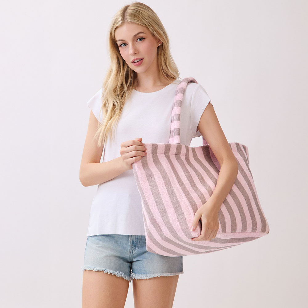 Details • Size : 22.5" X 13.5" X 9.5" • Inner Pocket • Magnetic Snap Closure • Material : 80% Polyester, 20% Polyamide • Classic striped tote bag designed for everyday summer use. Ideal for beach days, shopping, travel, or casual outings, this roomy carryall offers ample space for essentials while delivering a clean, timeless look that pairs easily with warm weather outfits and seasonal activities.