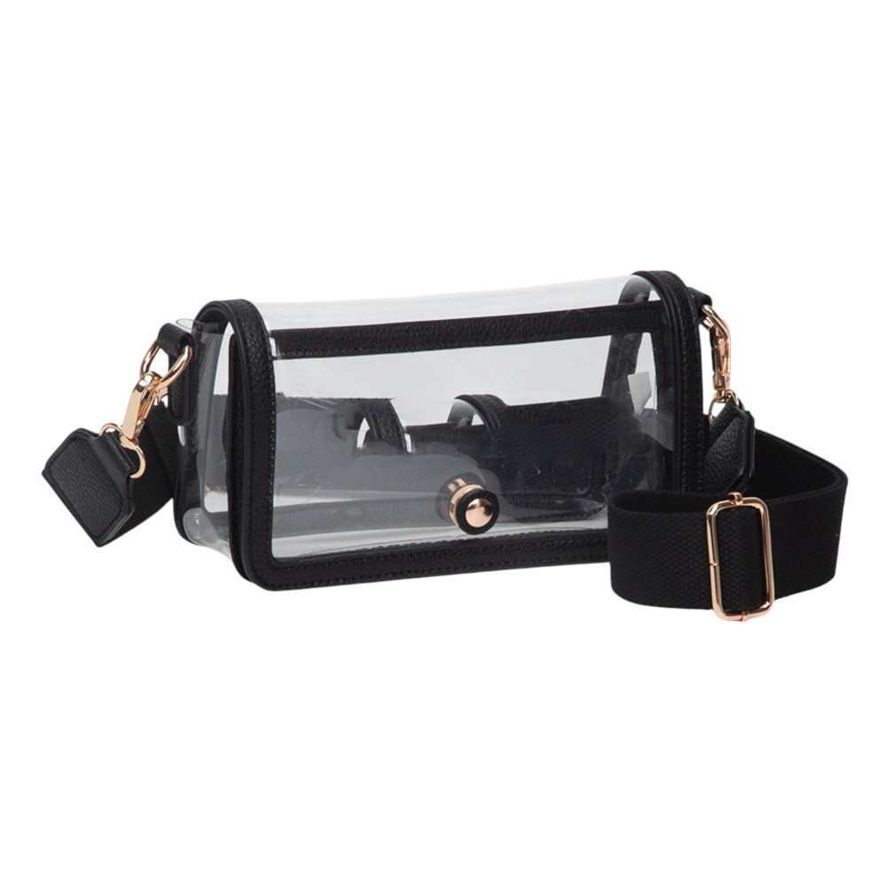 • Stay stylish and compliant with this clear stadium-approved crossbody bag, featuring black trim, secure snap closure, and an adjustable shoulder strap for comfort. Perfect for concerts, sporting events, festivals, and everyday use, offering convenience while meeting event regulations with ease.