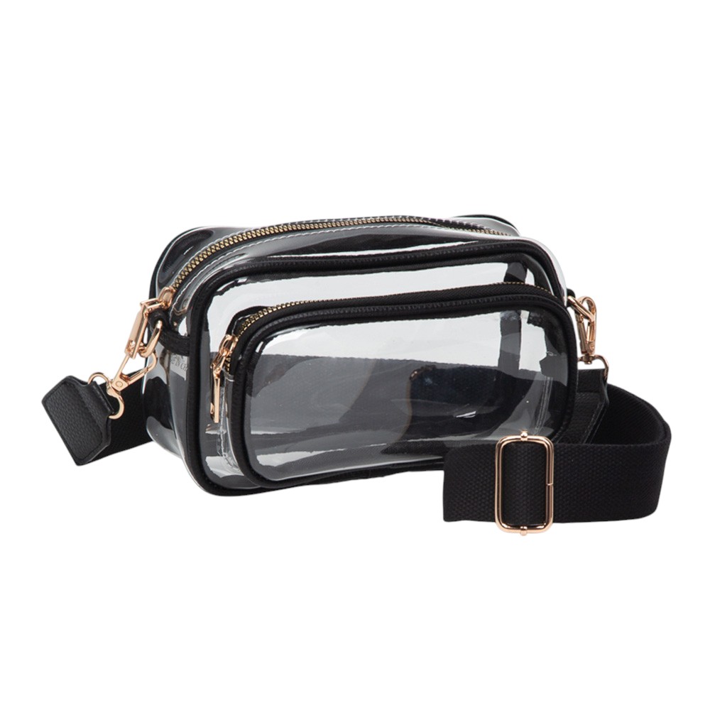 Details • Size : 8" X 5" X 3.5" • Strap Size : 53" L / Detachable, Adjustable • One Outside Zipper Pocket • Zipper Closure • Be game day ready with this clear stadium-approved crossbody bag, featuring white trim, dual zip compartments, and an adjustable strap for hands-free comfort. Perfect for concerts, sporting events, festivals, and venues with clear bag policies, offering style, security, and convenience on the go.