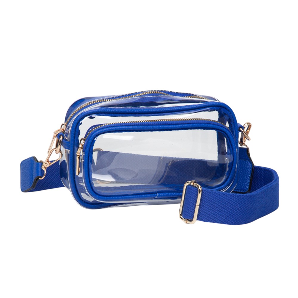 Details • Size : 8" X 5" X 3.5" • Strap Size : 53" L / Detachable, Adjustable • One Outside Zipper Pocket • Zipper Closure • Be game day ready with this clear stadium-approved crossbody bag, featuring white trim, dual zip compartments, and an adjustable strap for hands-free comfort. Perfect for concerts, sporting events, festivals, and venues with clear bag policies, offering style, security, and convenience on the go.