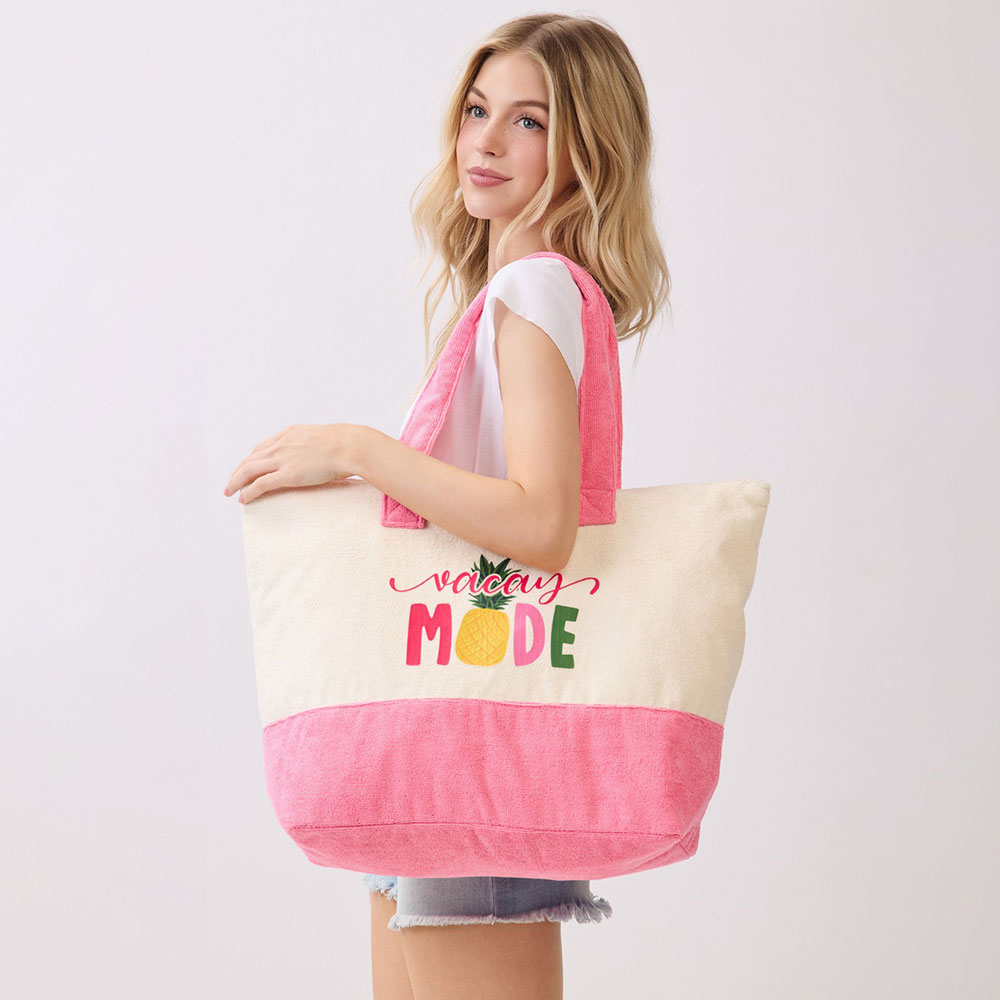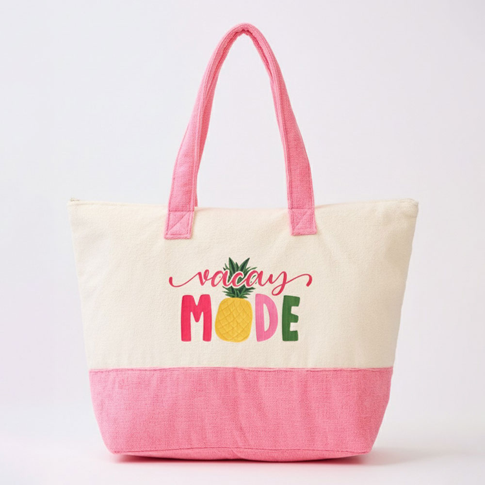 Details • Size : 22" X 16" X 6" • Inner Pocket • Zipper Closure • Material : 80% Polyester, 20% Polyamide • Spacious vacation themed tote bag featuring a playful “Vacation Mode” graphic design. Perfect for beach days, poolside lounging, shopping, or travel, this roomy carryall holds daily essentials with ease while adding a fun, relaxed statement to summer outfits and getaway looks.