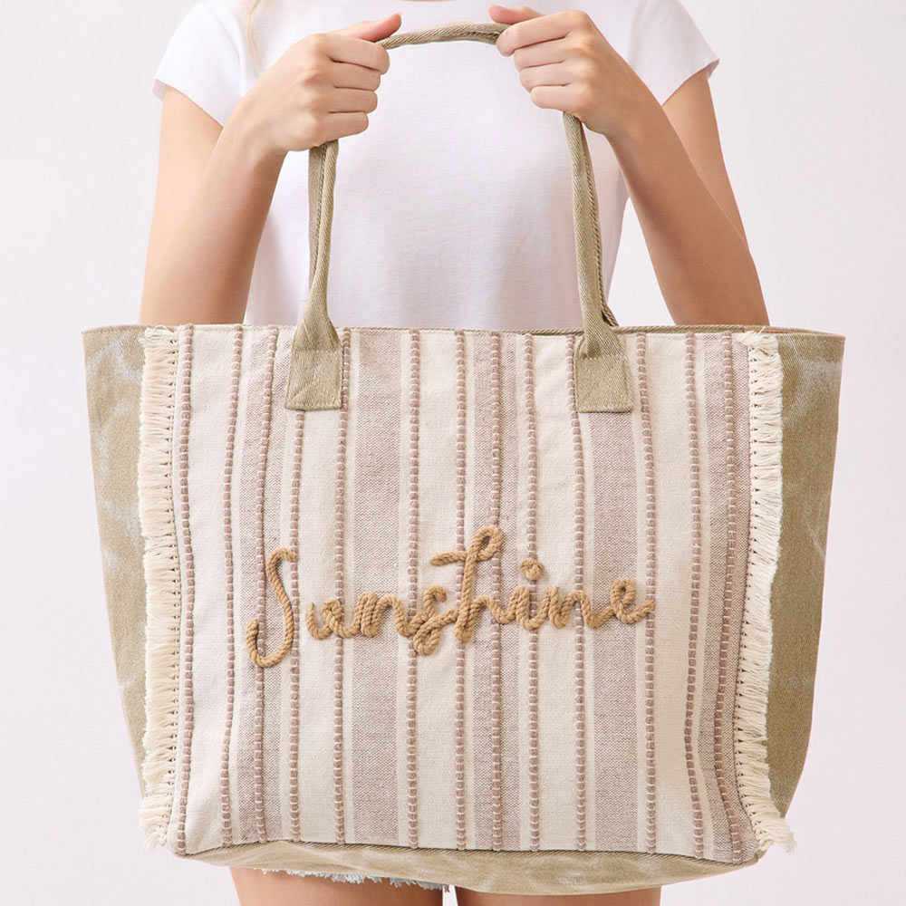 • Sunshine statement tote bag designed for everyday carry, beach days, and seasonal shopping trips. Features a roomy interior and eye-catching text detail that adds personality to casual outfits, vacation looks, and giftable summer collections. Perfect for boutiques and lifestyle displays.