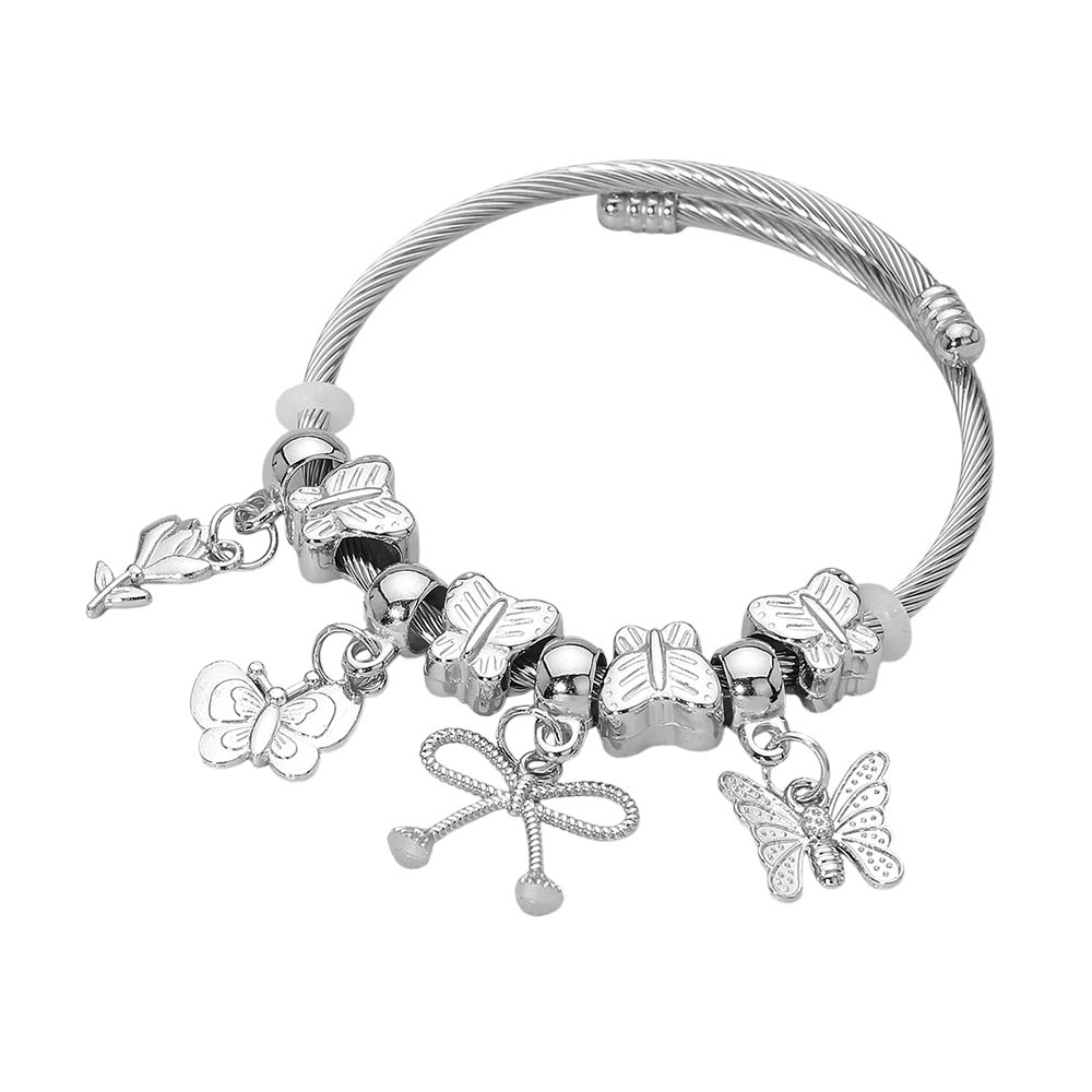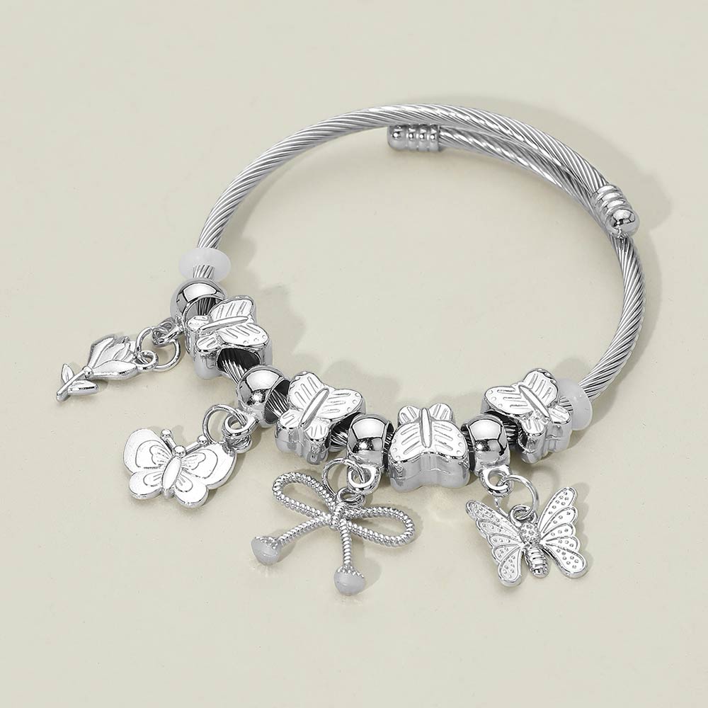 Details • Size : 0.2" H, 1.25" L • Adjustable • This adjustable cable bracelet features delicate butterfly charms paired with smooth accent beads for a graceful, feminine look. Designed for easy wear and flexible sizing, it adds playful movement and elegant detail to everyday outfits or special occasion styling, making it a charming addition to boutique jewelry collections and gift assortments.