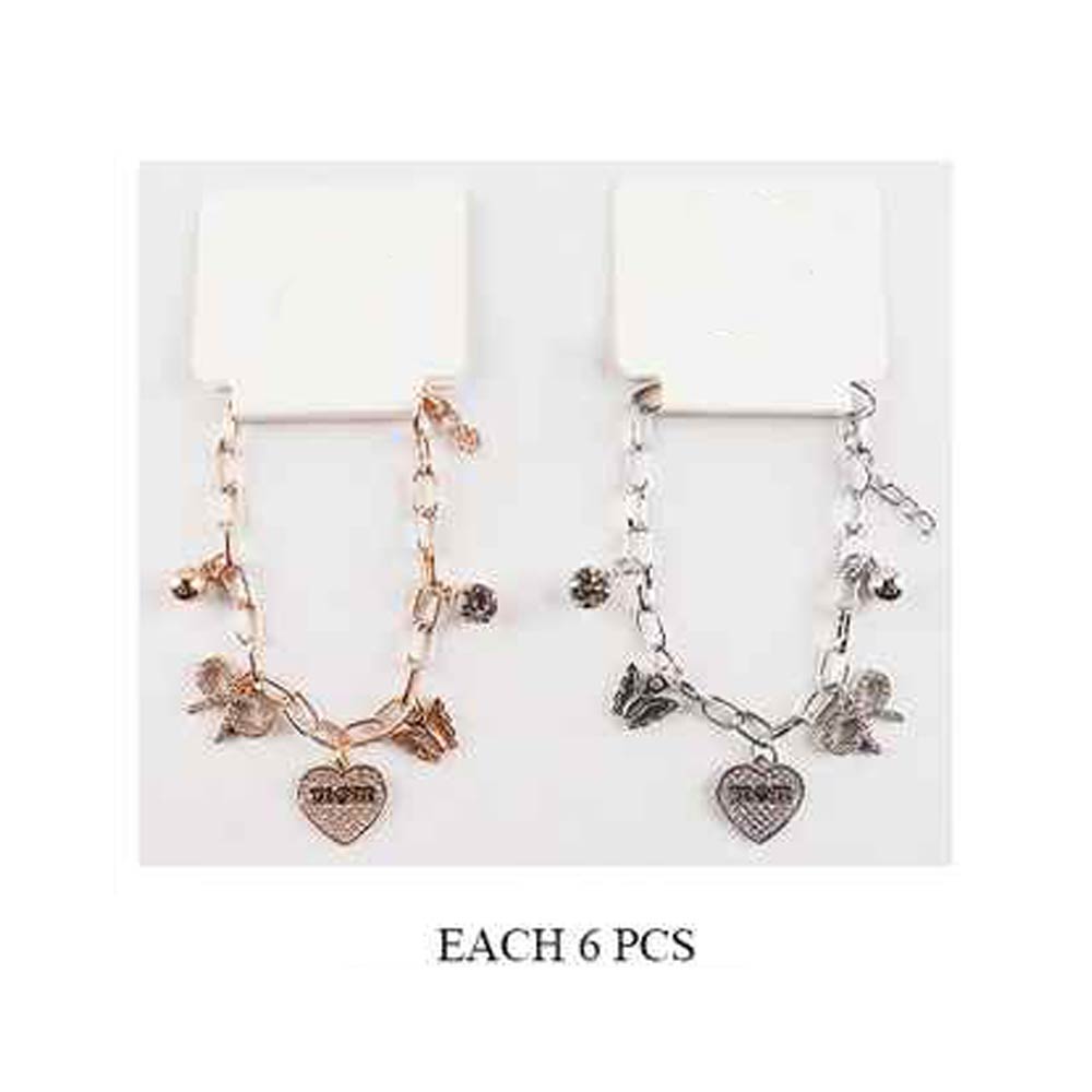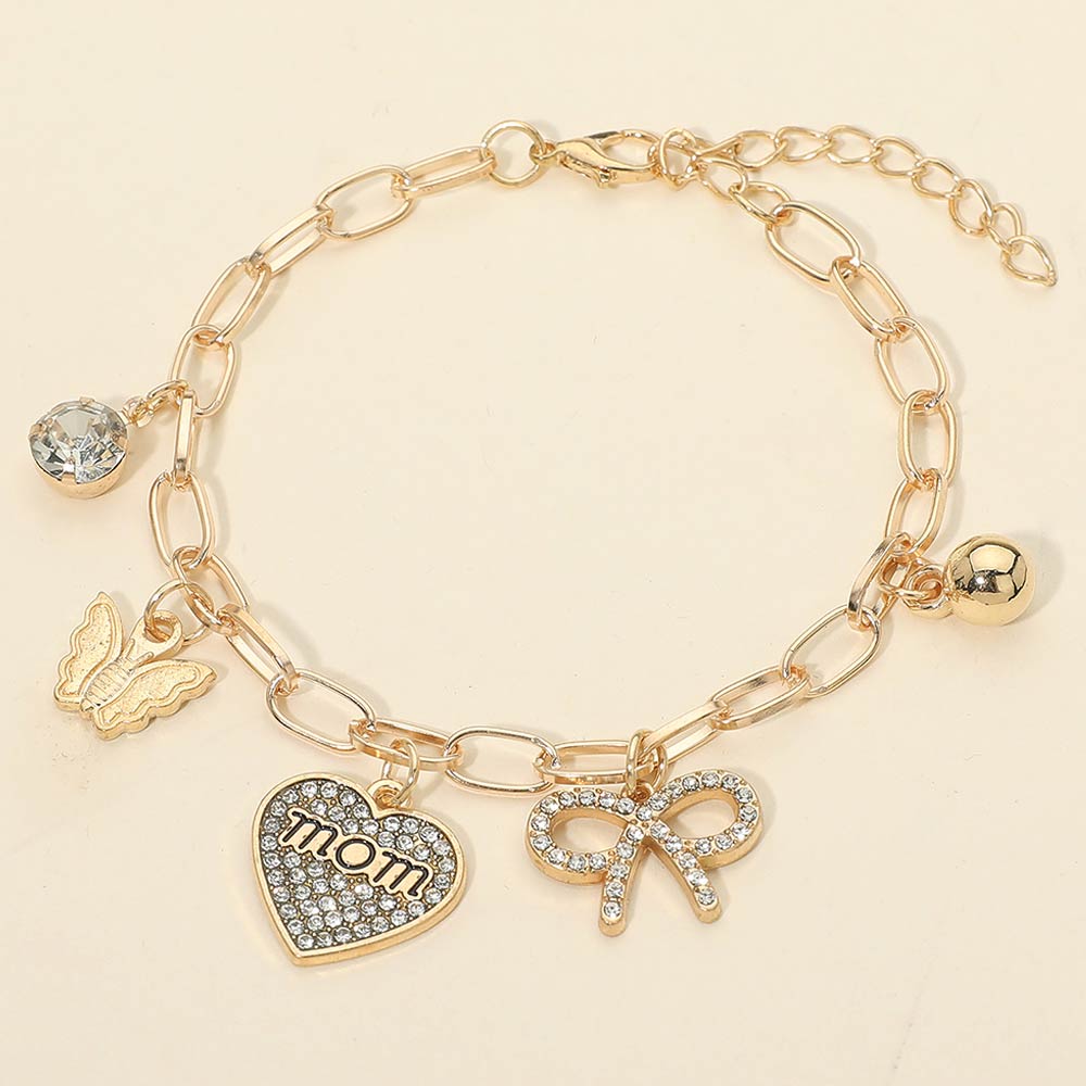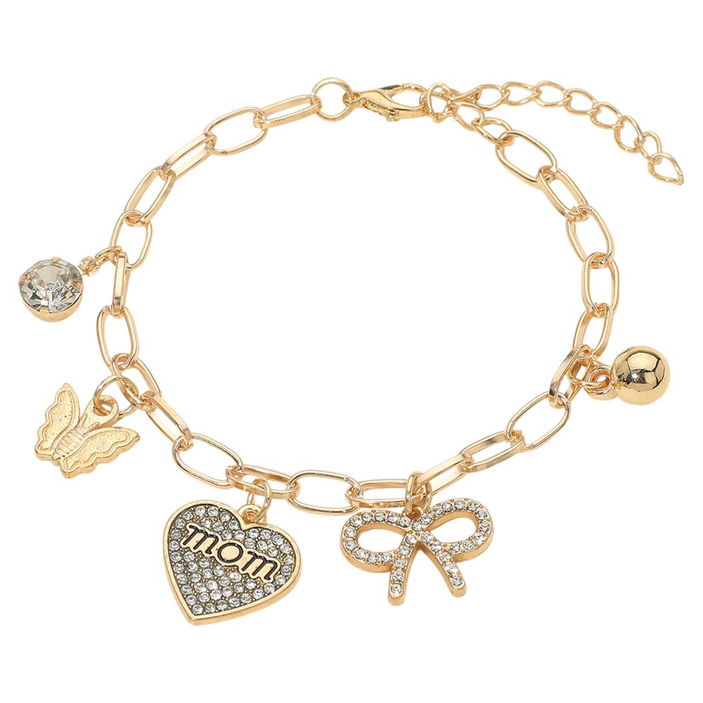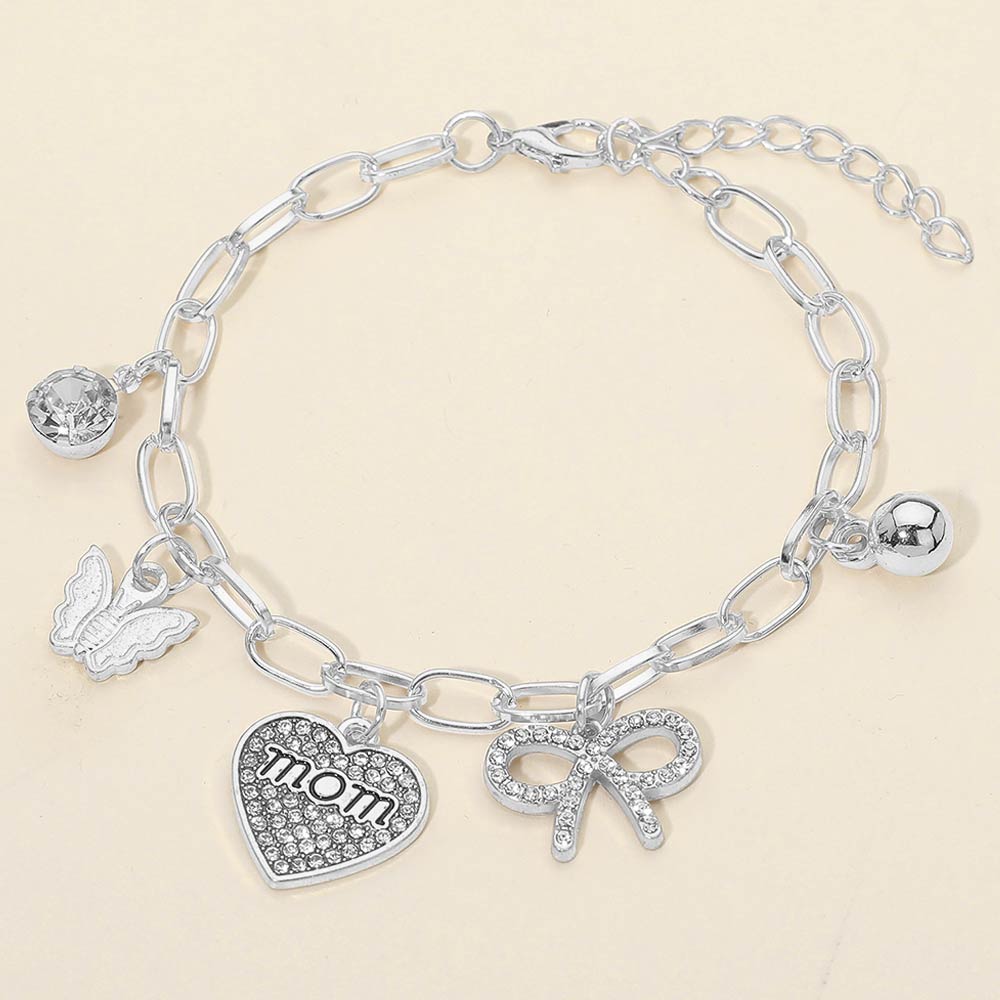 Details • Size : 0.2" H, 7.75" + 2" L • Charm Size : 0.8" L • Lobster Clasp Closure • This mom charm chain bracelet features a heart pendant with “mom” lettering, a bow accent, butterfly detail, and a dangling charm design. Finished with an adjustable chain for a comfortable fit, it’s ideal for Mother’s Day gifting, boutique jewelry collections, and meaningful everyday accessories that celebrate love and family.