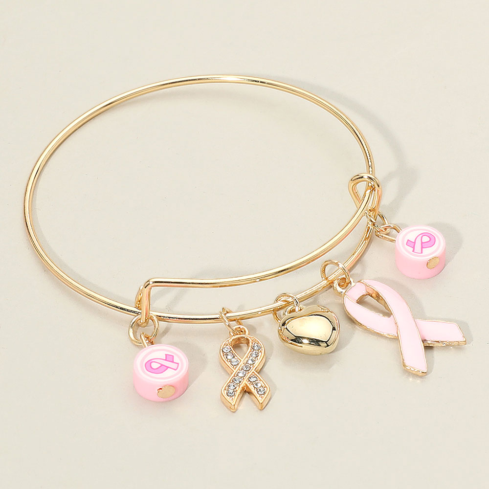 Details • Size : 0.3" H, 2.4" D • Charm Size : 1" L • Hook Closure • This ribbon charm bangle bracelet combines fashion and inspiration with delicate symbolic charms. A meaningful accessory that adds style and support, making it perfect for everyday wear or as a thoughtful gift for someone special.