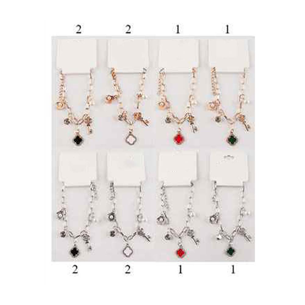 Details • Size : 0.2" H, 7.75" + 2" L • Charm Size : 0.8" L • Lobster Clasp Closure • This quatrefoil, pearl shell, key charm chain bracelet features a symbolic clover pendant, key accent, pearl-style detail, and crystal-inspired drop charms. Designed with a toggle closure and adjustable chain for easy wear, it’s a versatile accessory for everyday styling, giftable jewelry collections, and boutique selections focused on charm and meaning.