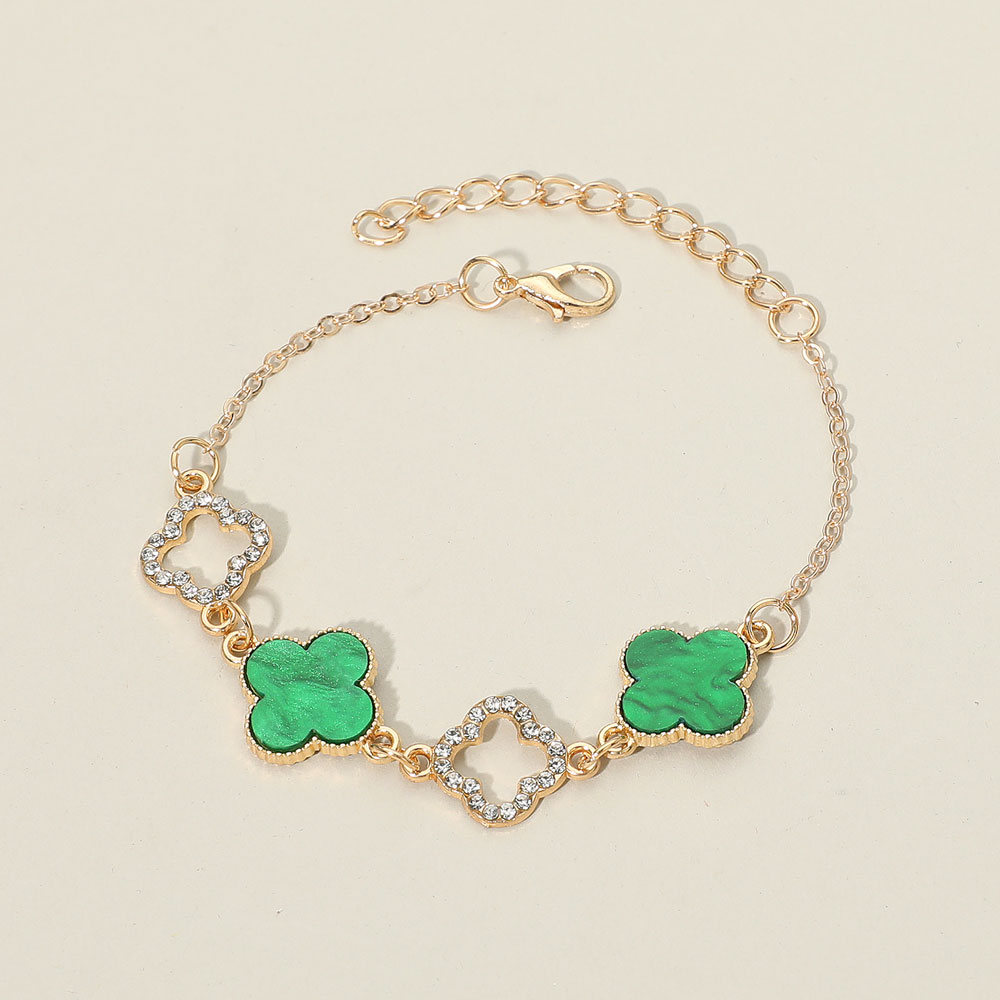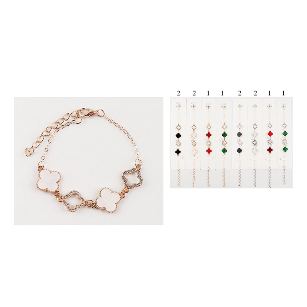 Details • Size : 0.6' H, 7" + 2" L • Lobster Clasp Closure • This elegant bracelet features a series of quatrefoil-shaped links, alternating between enamel and crystal-studded designs for a refined, balanced look. The adjustable chain ensures a comfortable fit, making it a perfect accessory for adding subtle sparkle and charm to any outfit.